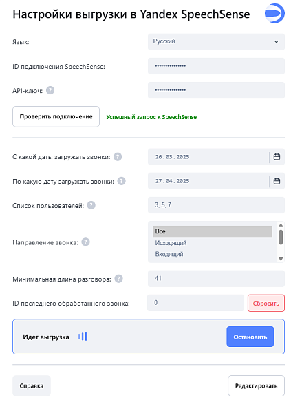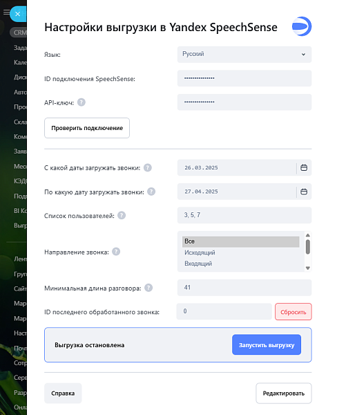 Выгрузка звонков в Yandex SpeechSense для аналитики.
