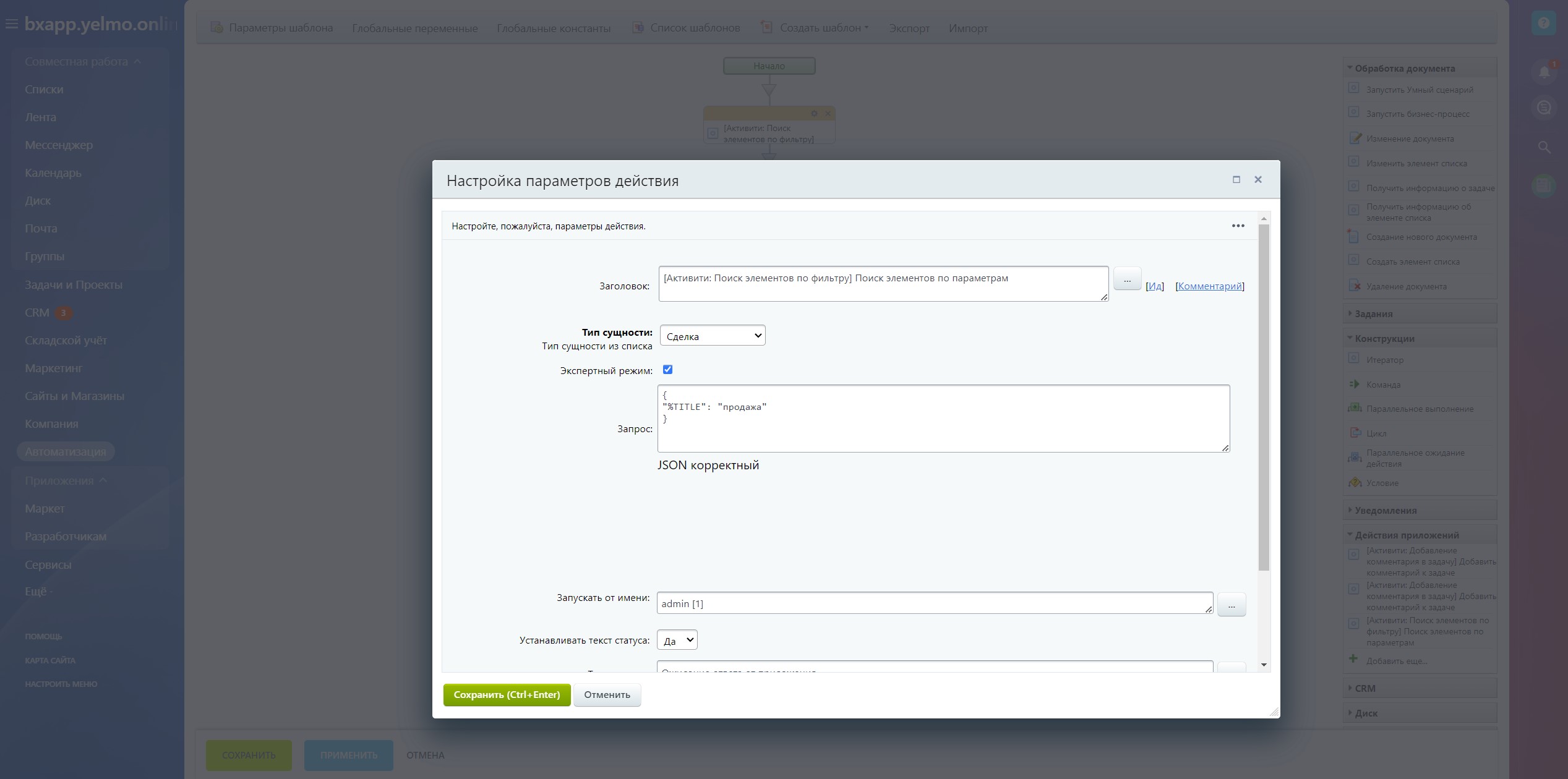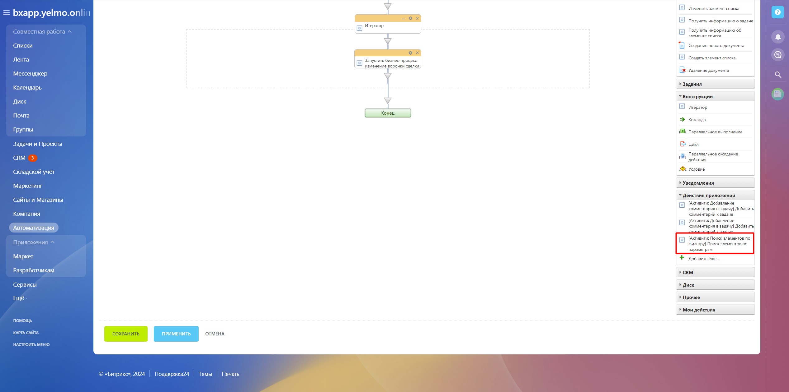 Активити в конструктор бизнес-процессов, позволяющее найти все элементы CRM или универсального списка, по заданным параметрам, для последующей обработки.