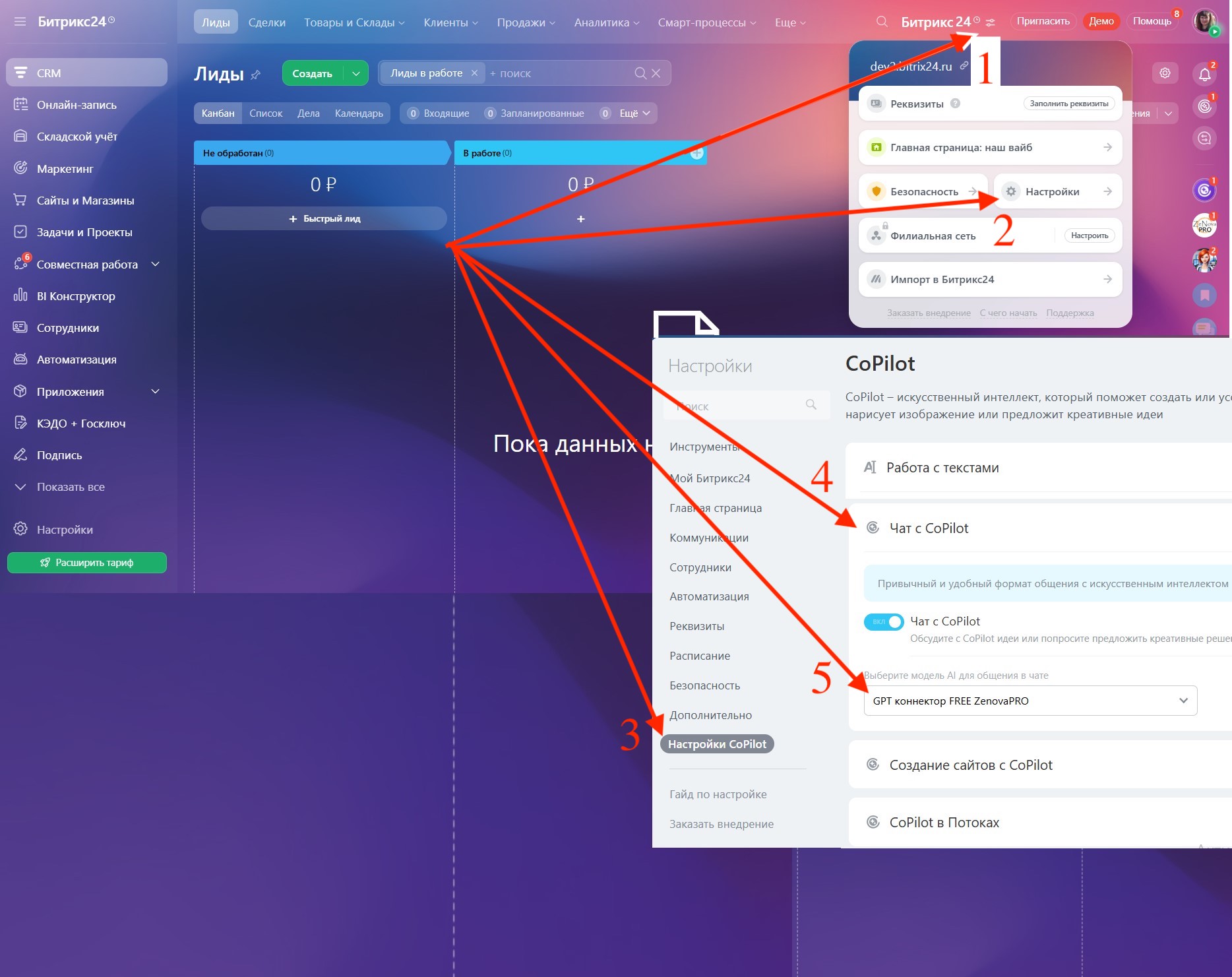 1. Перейдите в настройки портала и установите модель GPT коннектор ZeNova PRO смотреть скрин