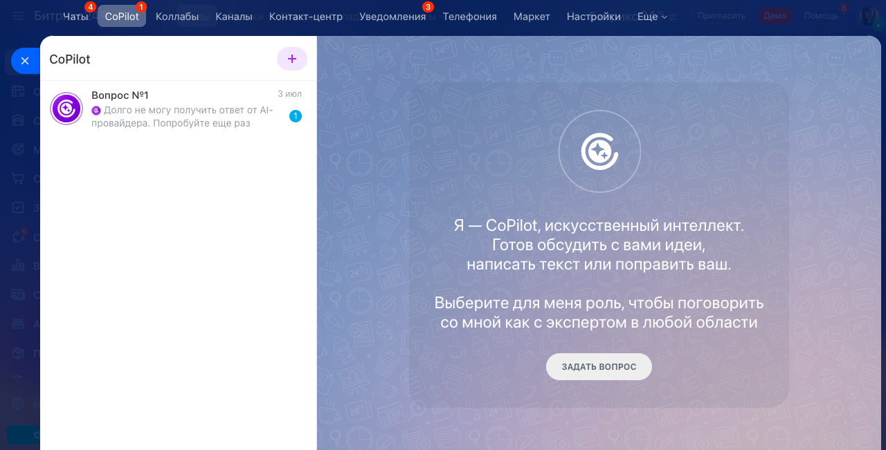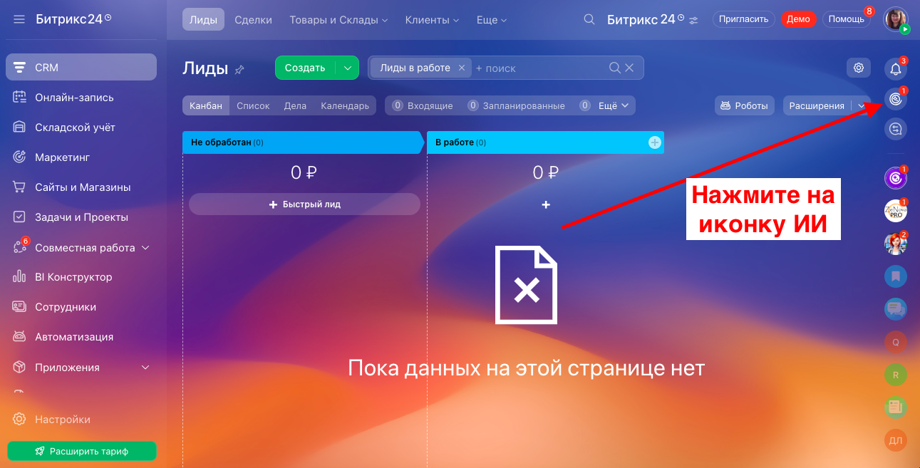 2. Запустите ИИ чат в Битрикс (иконка ИИ в левом меню) смотреть скрин