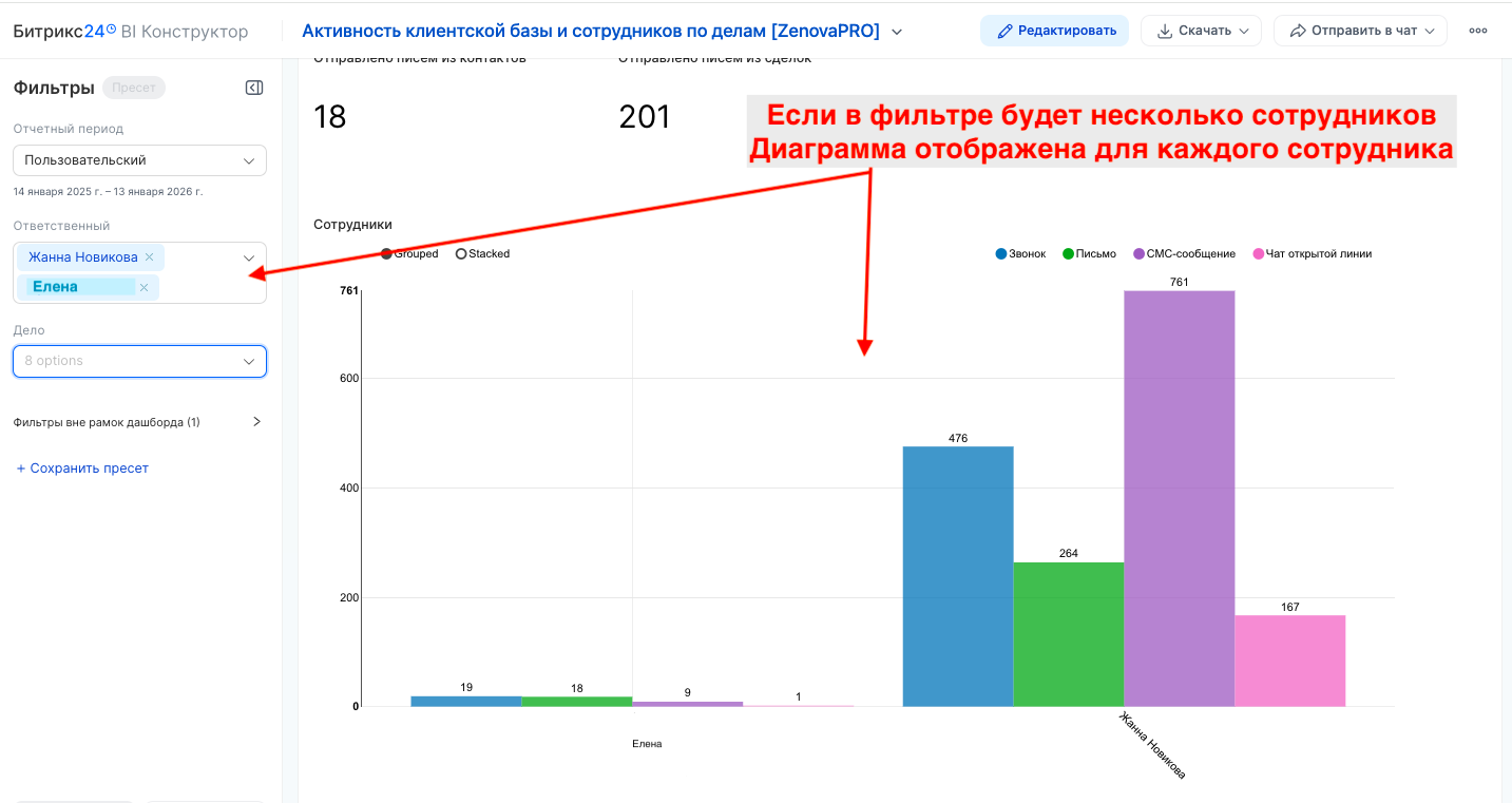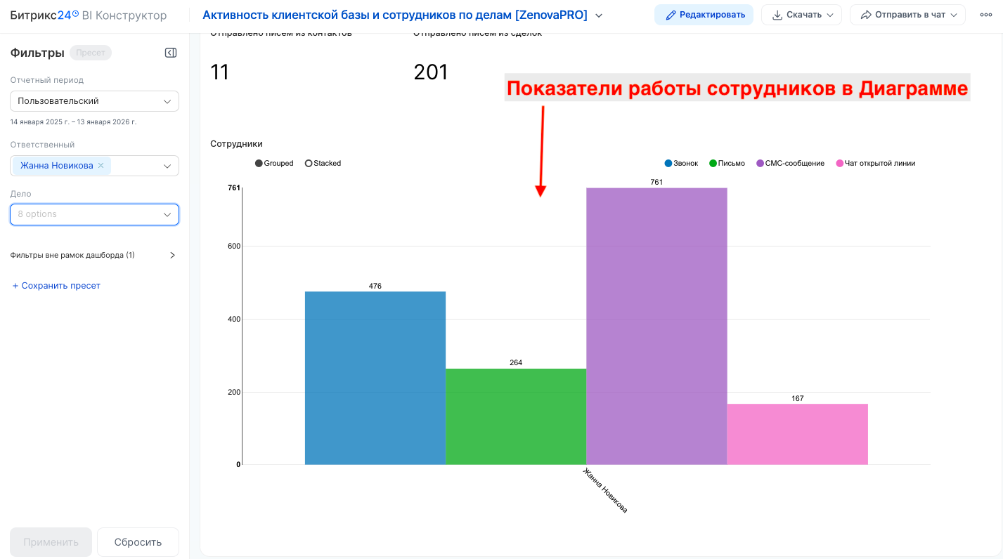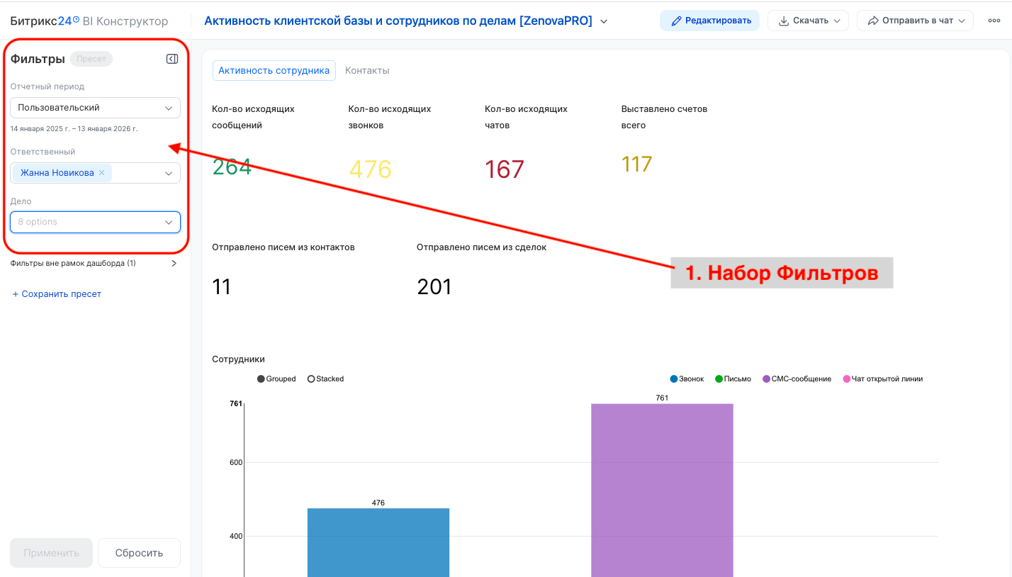 - гибкий фильтр по временному диапазону, выбору сотрудников, типа дел, выбор воронок направлений