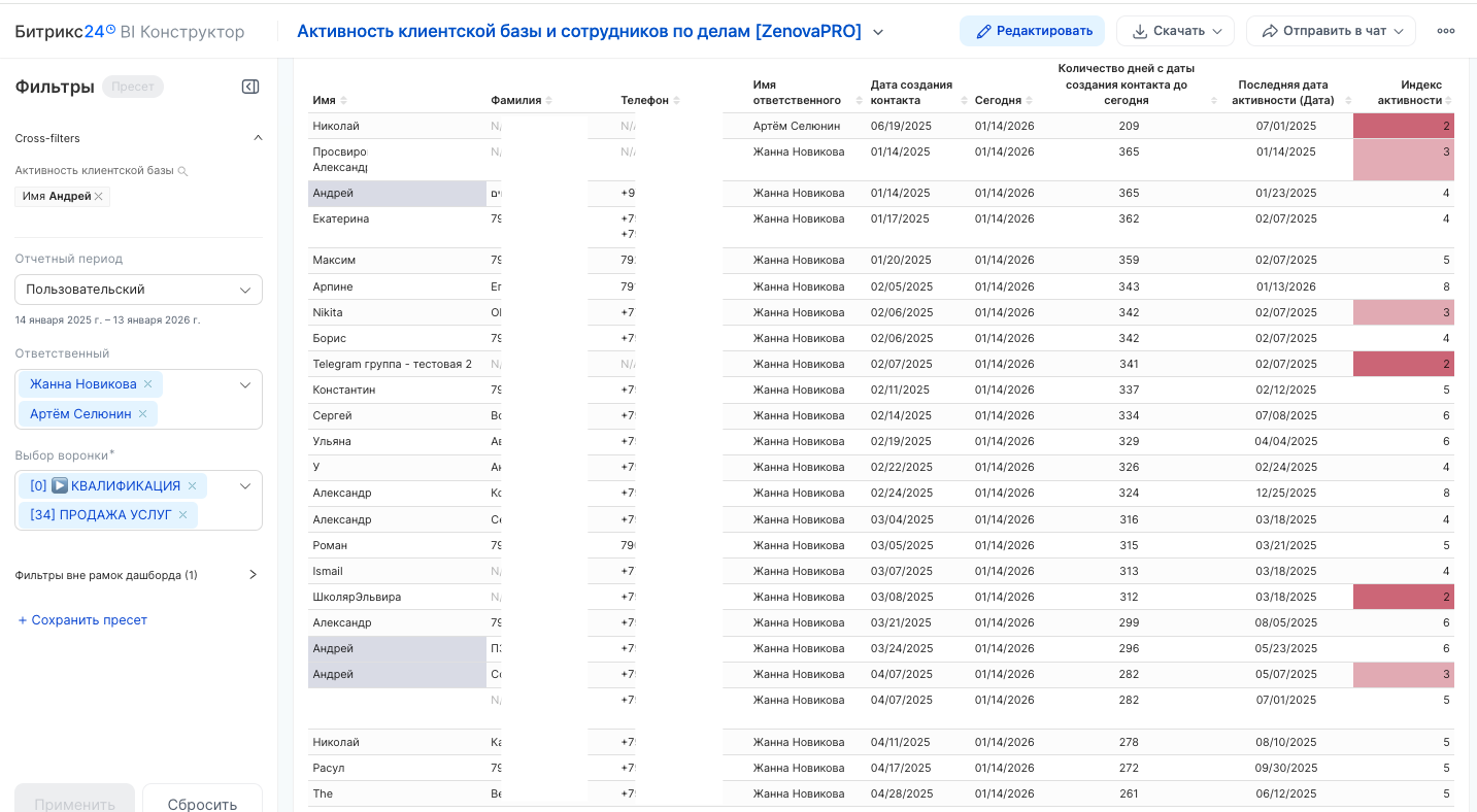- таблица анализа Клиентов наглядная таблица по клиентам, баллам, дате последней активности и пр