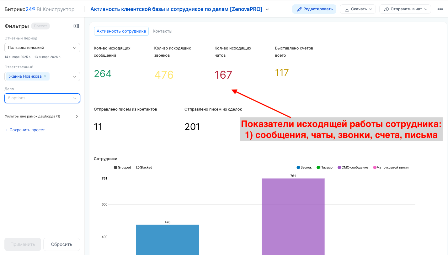 - показатель исходящей работы ваших сотрудников сколько исходящих звонков, сообщений, чатов, емайл писем, счетов