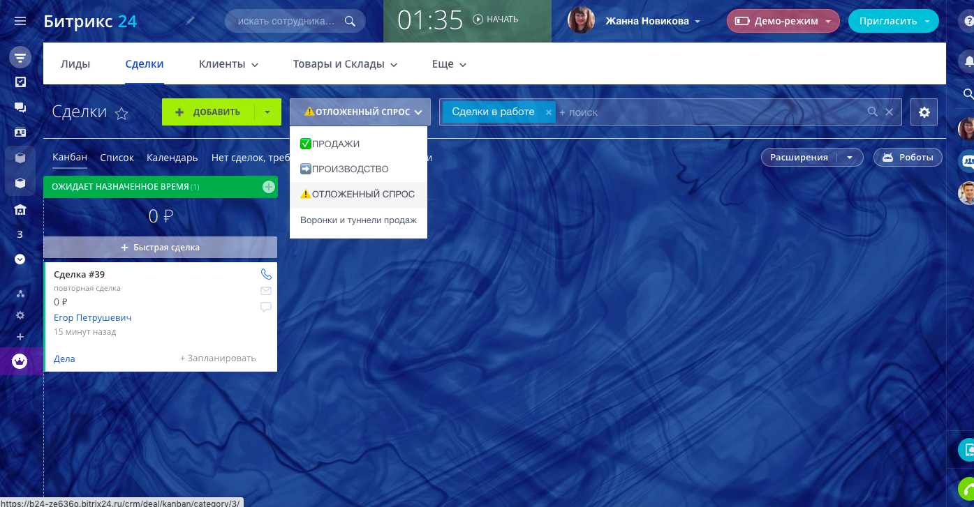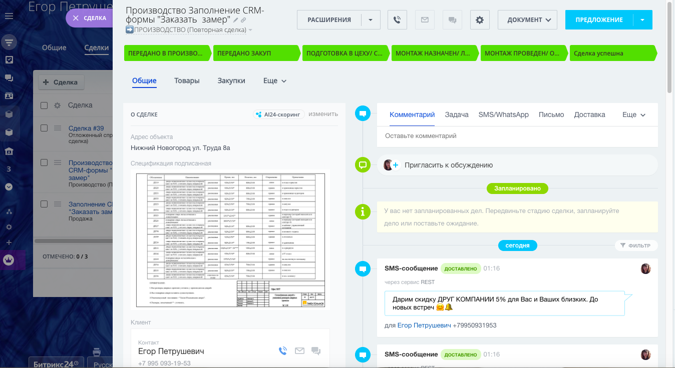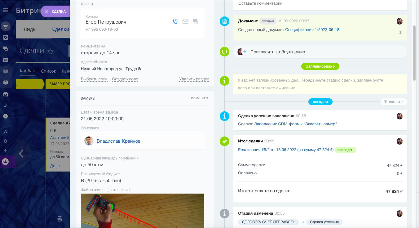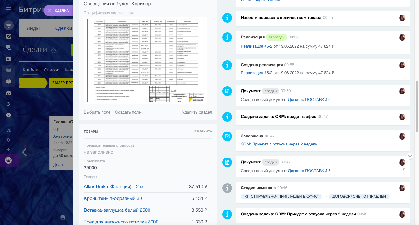 - Карточка сделки с необходимыми полями