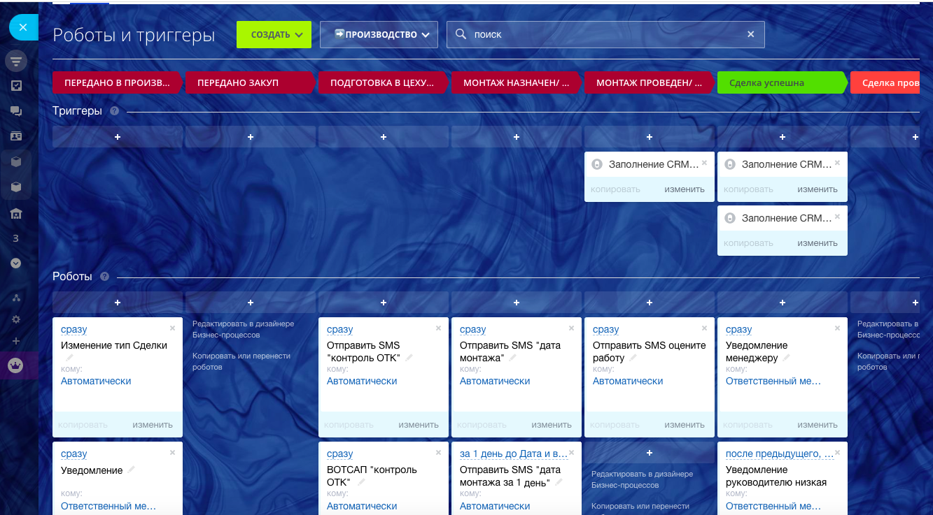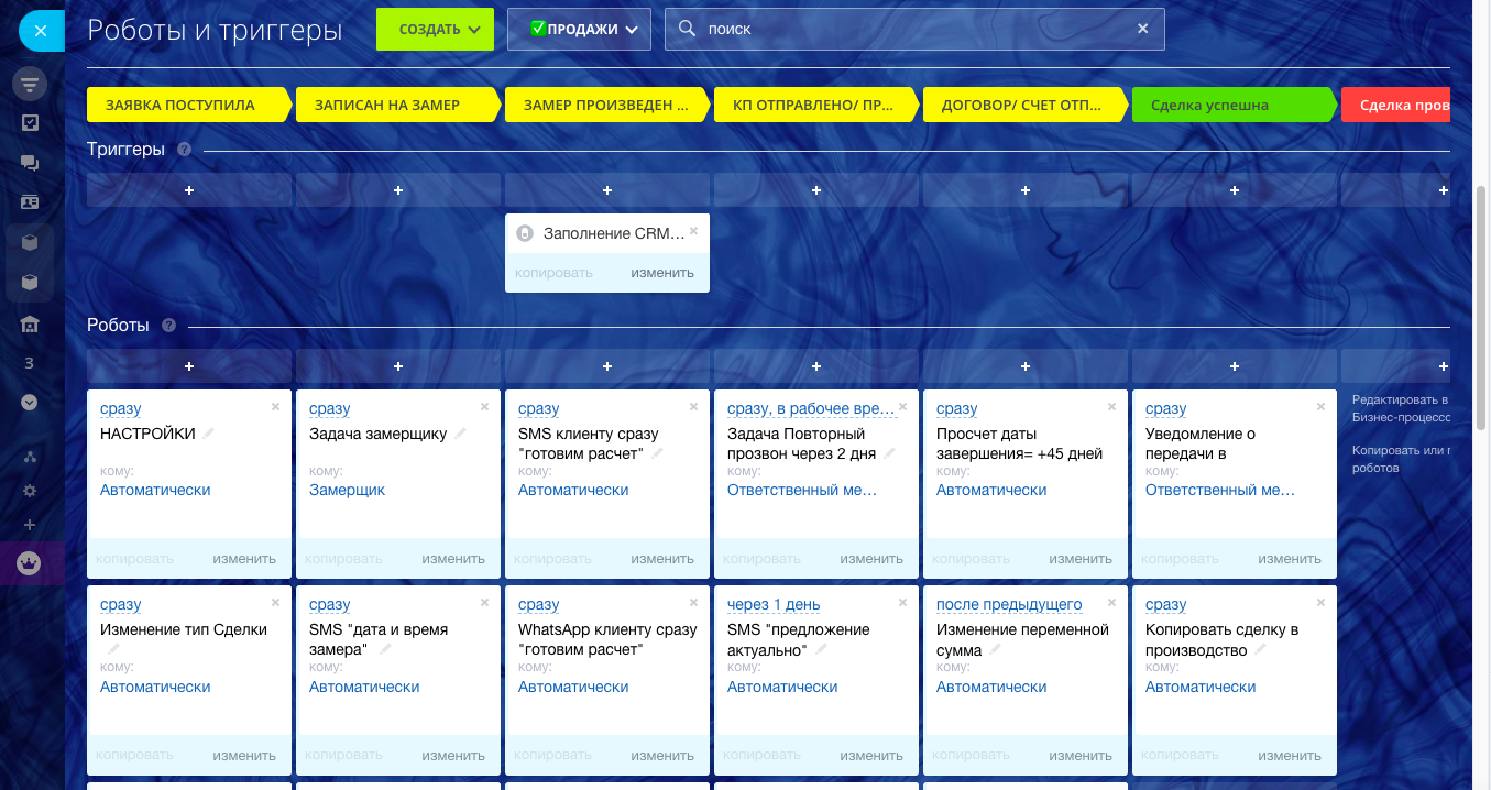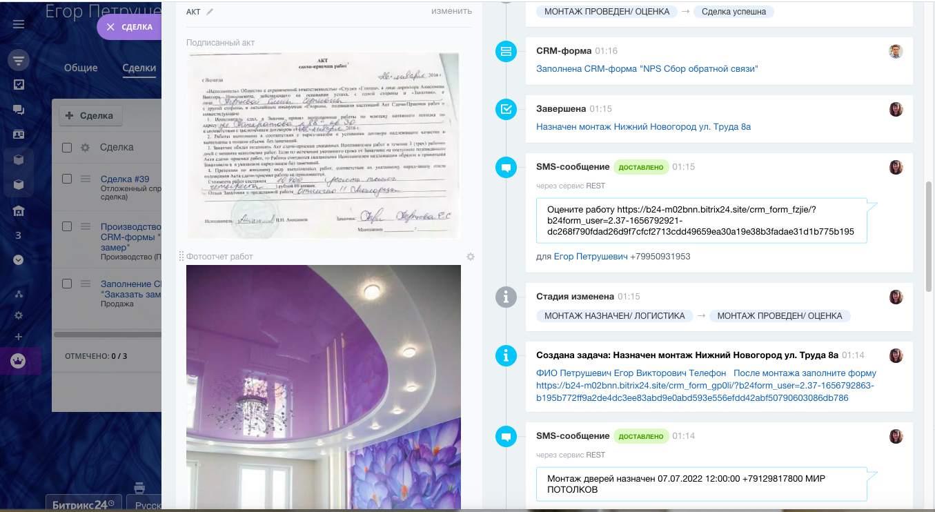 CRM Натяжные ПОТОЛКИ помогает работать как компании внутри, так и с клиентами в автоматическом режиме. В данном решении корректно учтены все этапы для правильного расчета конверсии, контроля менеджеров и отработки рекламного бюджета! Автоматические Вотсап и смс сообщения удерживают клиента, пока он особенно горячий, в течение 7 дней. Мы стремимся свести к минимуму трудозатраты и человеческий фактор. Готовая CRM прекрасно справляется с этой задачей!