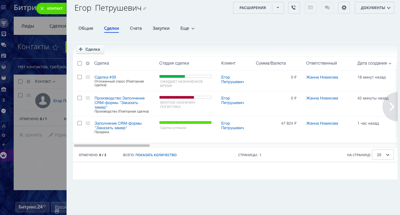 - Карточка контакта с необходимыми полями