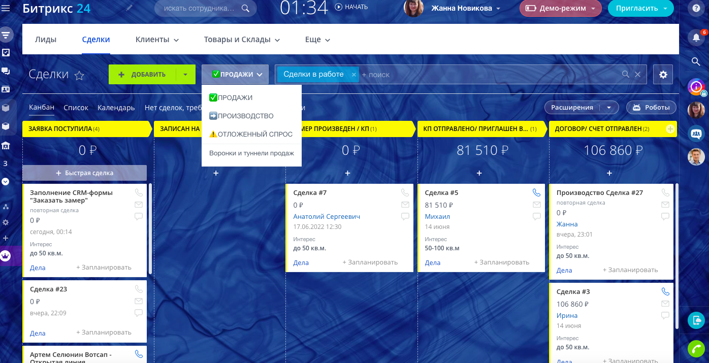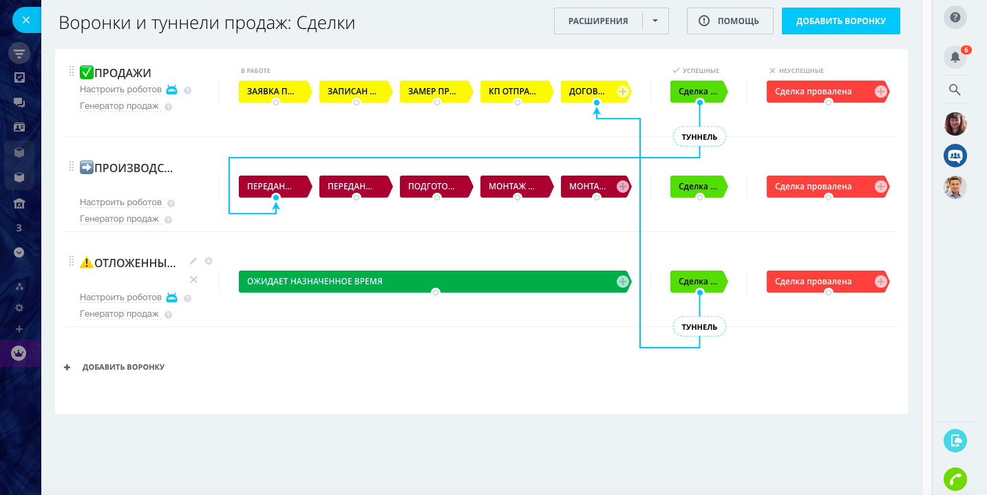 - Карточка сделки с необходимыми полями для каждой воронки