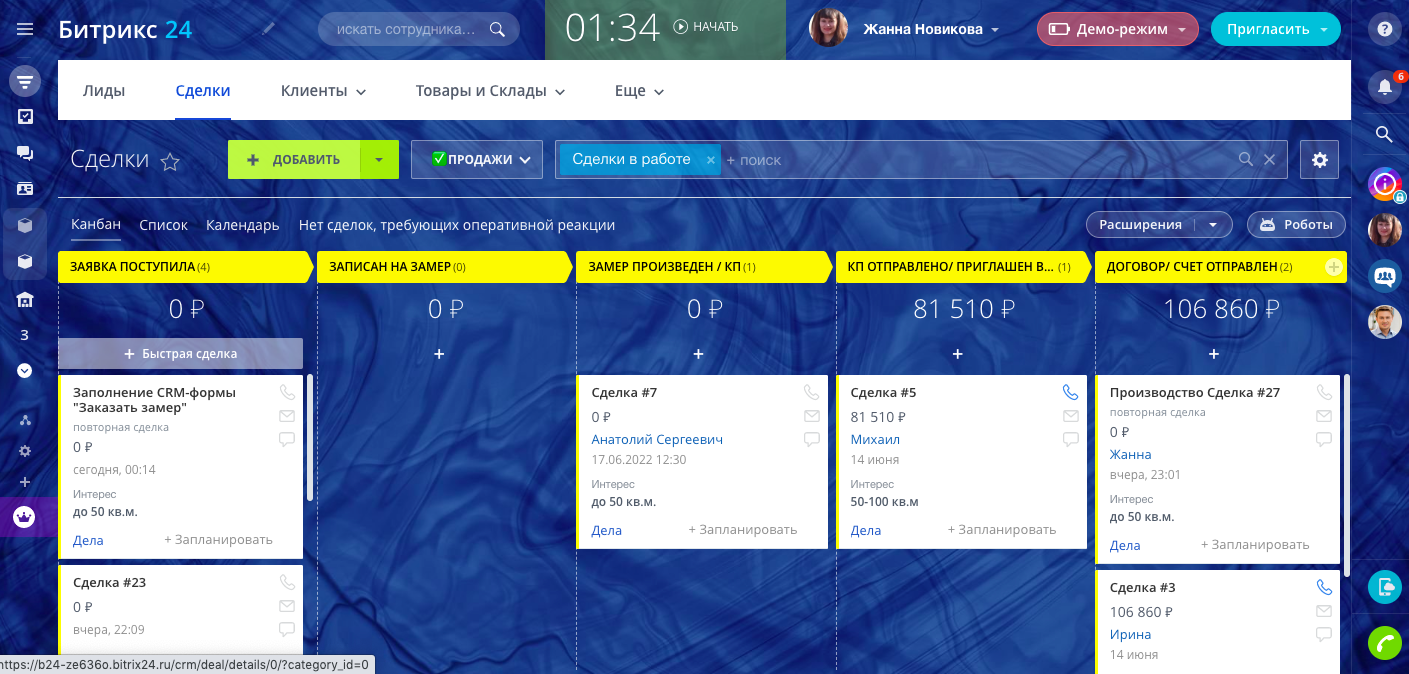 Готовая ЦРМ для сферы натяжных потолков. Продуманы сценарии автоматизации как для менеджеров, так и для клиентов. CRM Натяжные ПОТОЛКИ отвечает всем современным требованиям и задачам. Реализованы сценарии как продажи, монтажа и замера натяжных потолков, так и сервисное дополнительное обслуживание. Включает в себя все последние новинки Битрикс24.