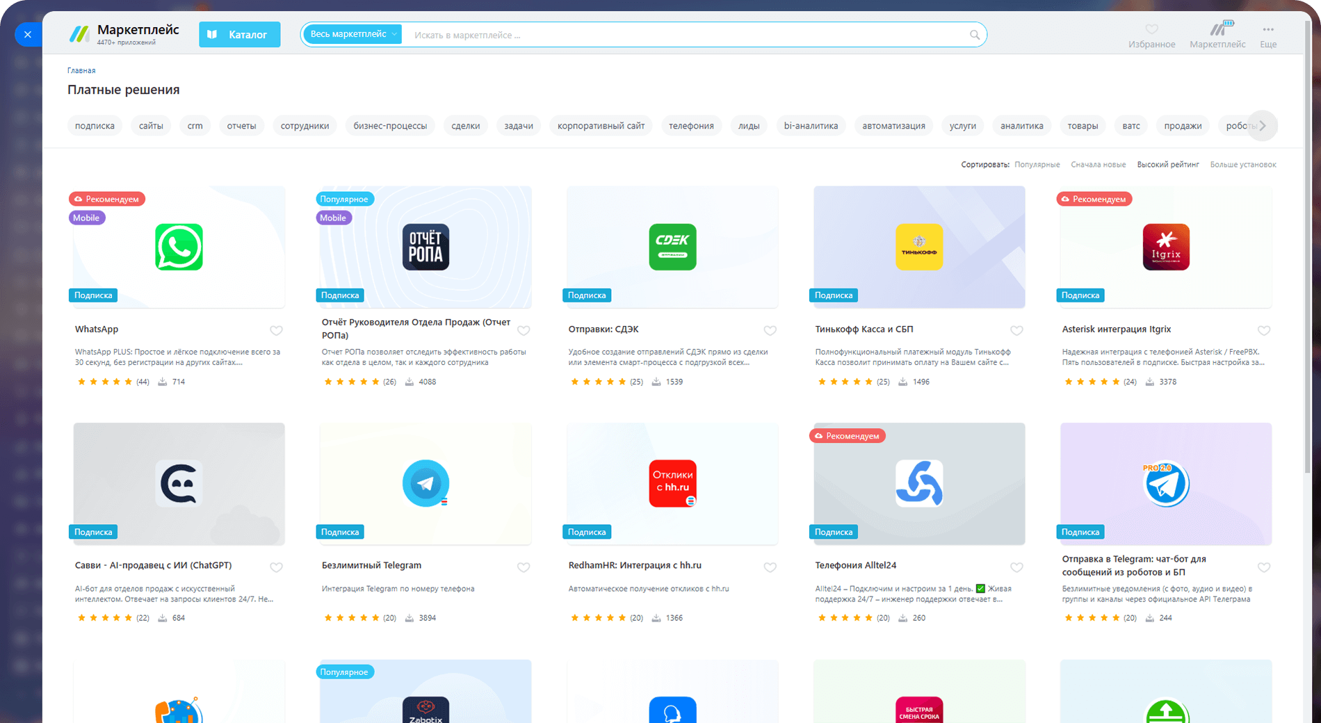 - С подпиской вы получаете неограниченный доступ к готовым решениям для вашего бизнеса. В каталоге — более 5 480 приложений: мессенджеры, чат-боты, интернет-магазины и другие сервисы.