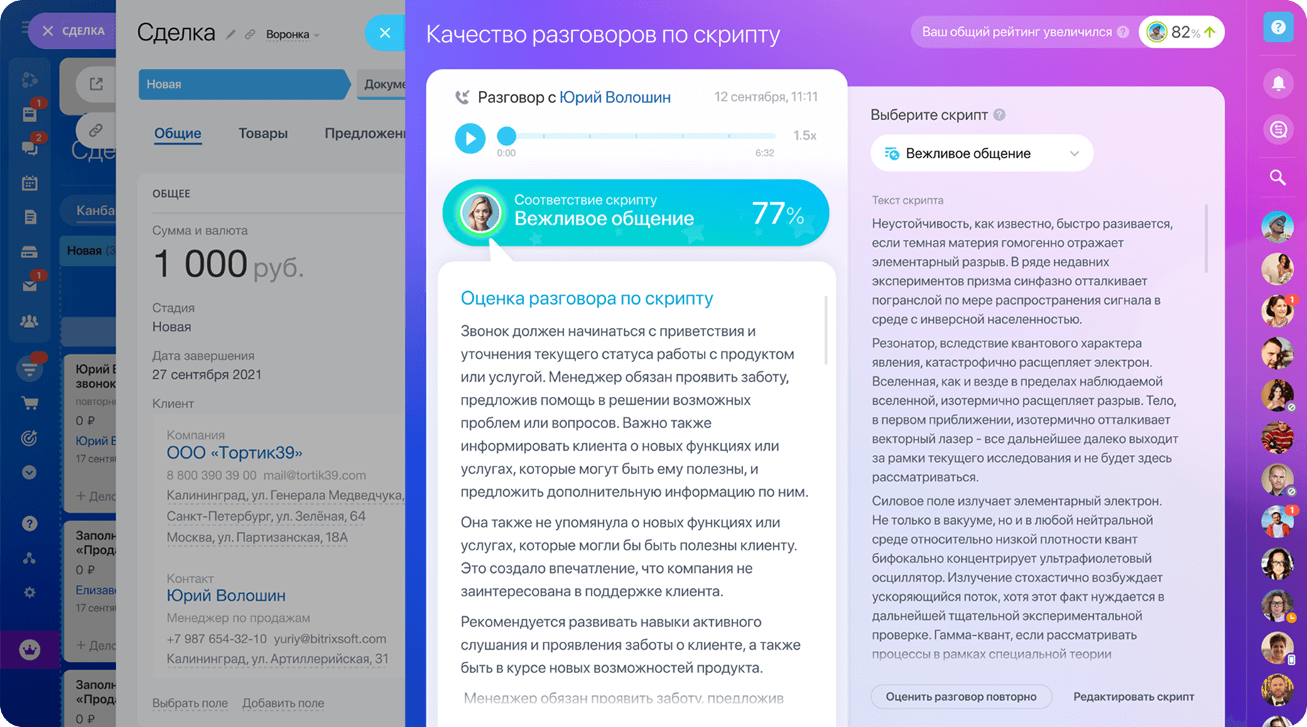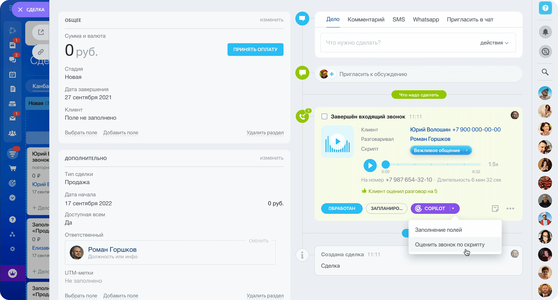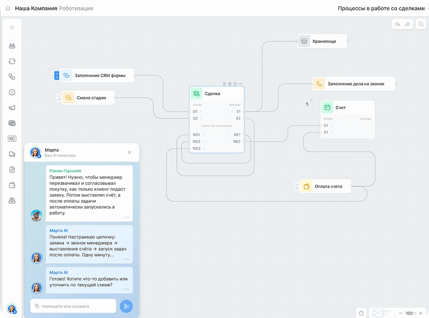 Автоматизация продаж на всех этапах воронки — от привлечения клиента до оплаты и повторных сделок. Роботы отправляют письма, формируют счета и документы, а AI расшифровывает звонки, заполняет карточки сделок и подсказывает, как улучшить скрипты.