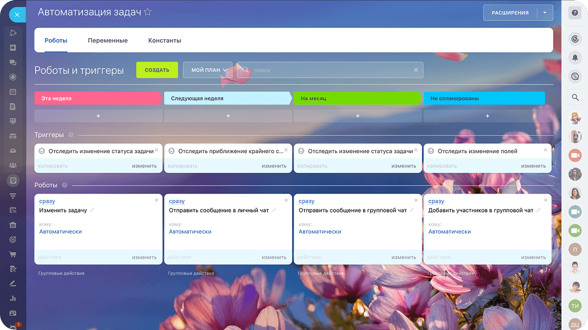 Автоматизируйте процессы без программирования — с помощью роботов в Битрикс24. Все как в конструкторе: вы указываете действия и порядок их выполнения — роботы делают всё сами.