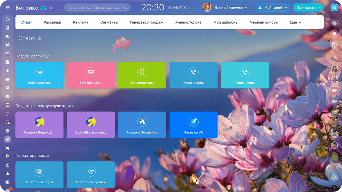 Битрикс24 сам придумает идею рекламной кампании, напишет текст, запустит персональные рассылки и онлайн‑рекламу, а затем отследит эффективность каждого объявления вплоть до отдельного слова.