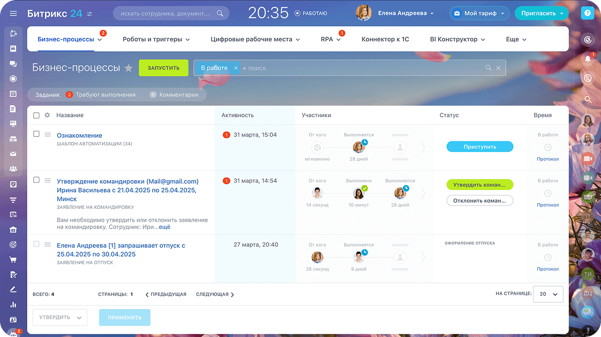 Автоматизация типовых процессов — от согласования документов и оплаты счетов до оформления командировок и работы IT-служб. Все процессы прозрачны: видно, где застряла задача и кто за неё отвечает.