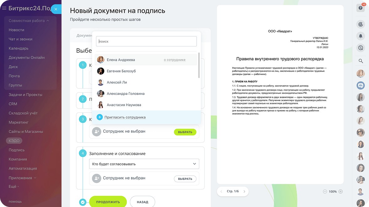 Создавайте стандартизированные процессы и рабочие места, точно настроенные под задачи сотрудников и отделов. Например, в рабочем месте HR автоматизированы все этапы взаимодействия с кандидатами — от найма до увольнения