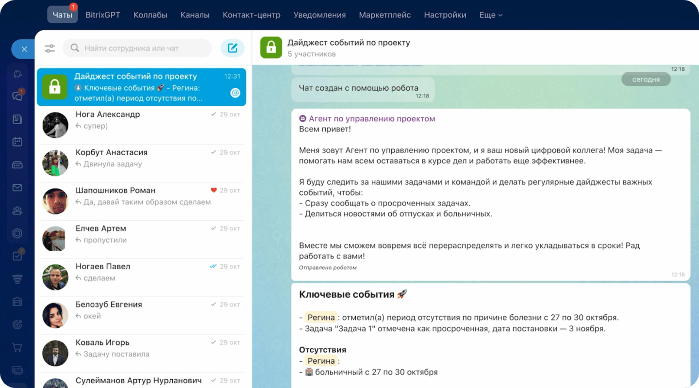 Роботы ставят задачи, контролируют сроки, отправляют уведомления и двигают проекты по стадиям в канбане. AI помогает формулировать ТЗ, планировать этапы, составлять чек-листы и делать саммари обсуждений.