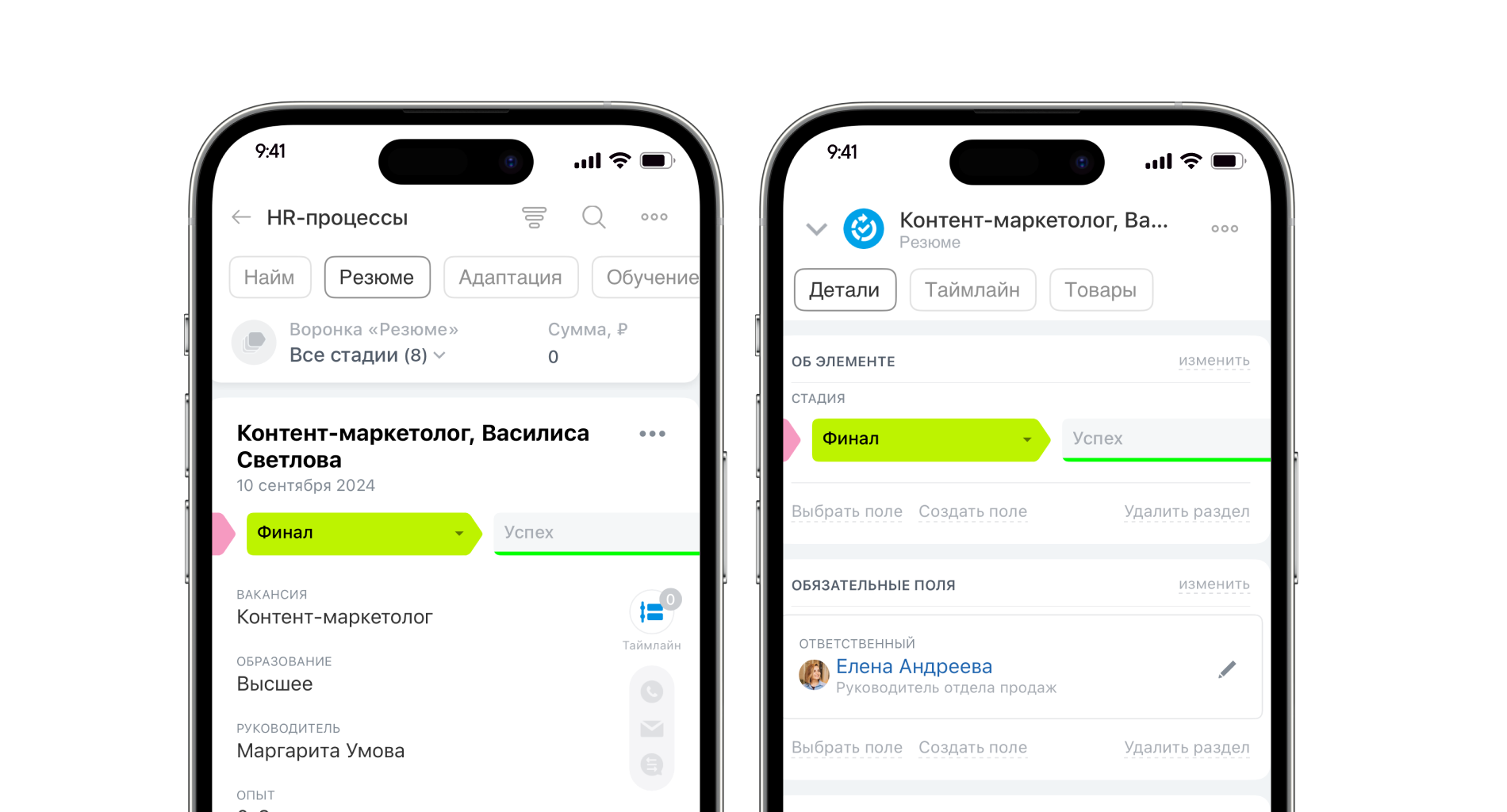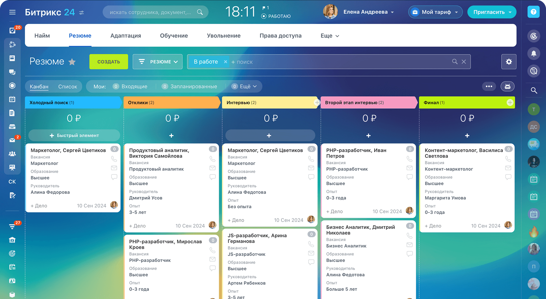 Резюме кандидатов собираются в Цифровом рабочем месте рекрутера и проходят по всем этапам процесса найма.