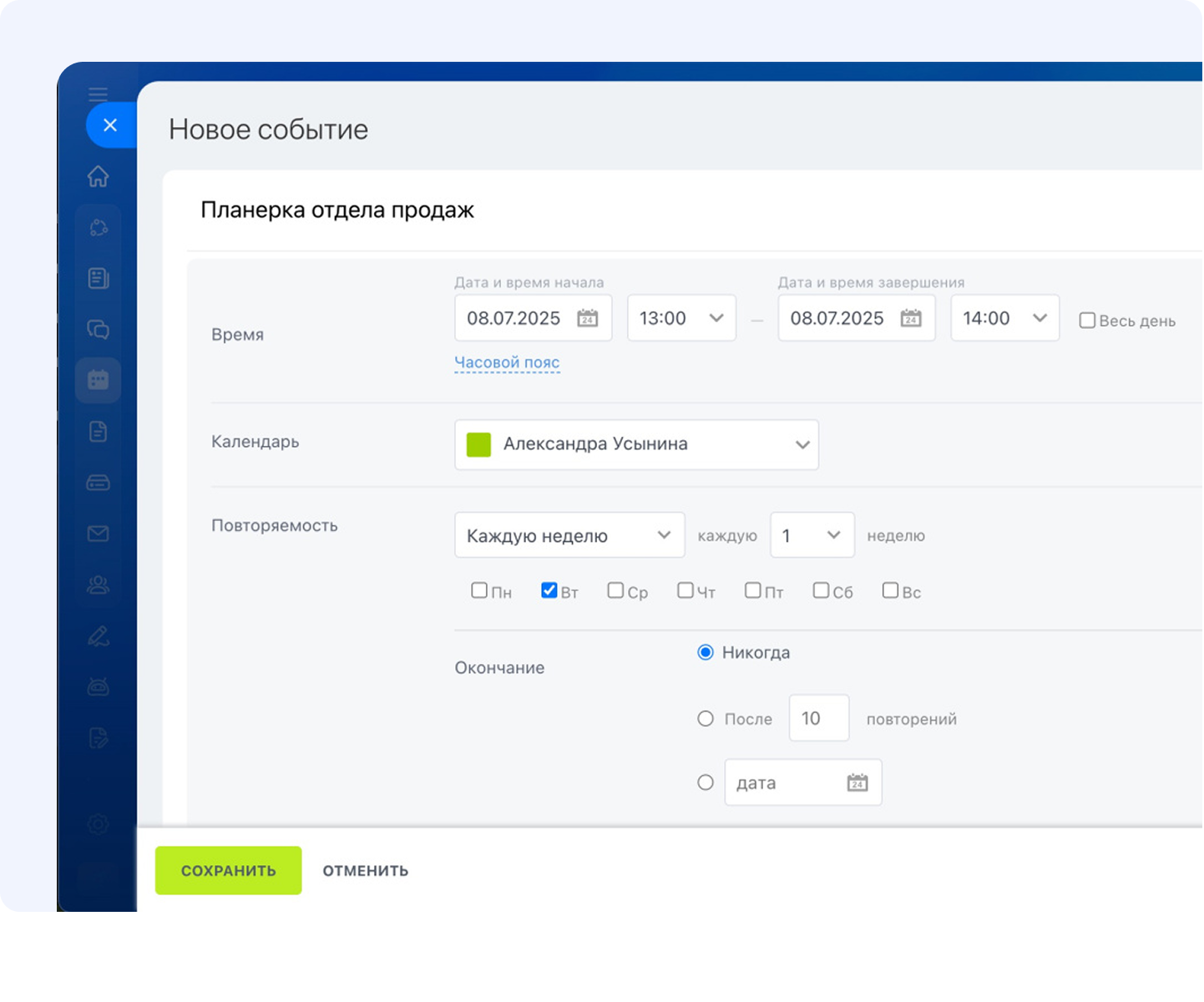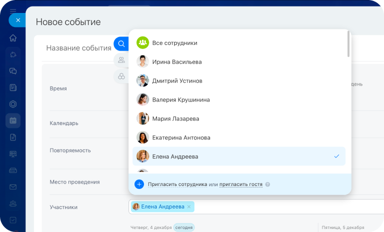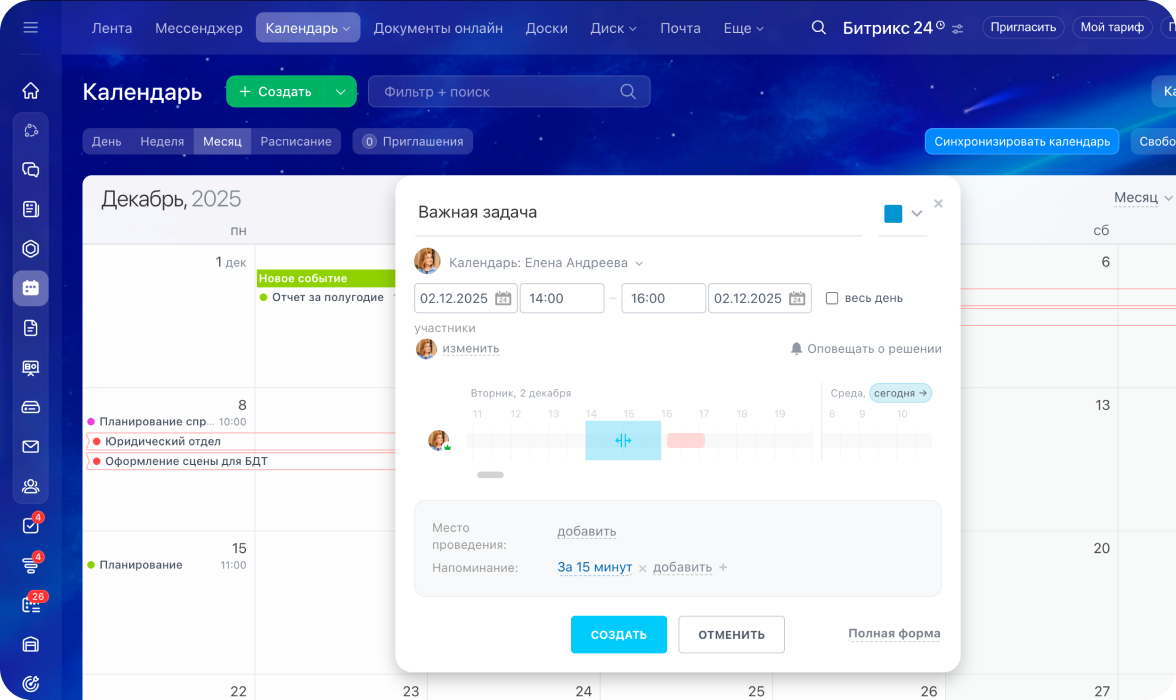 Событие создаётся в пару кликов: укажите время, участников, напоминания и дополнительные параметры. При необходимости событие можно связать с карточкой CRM.