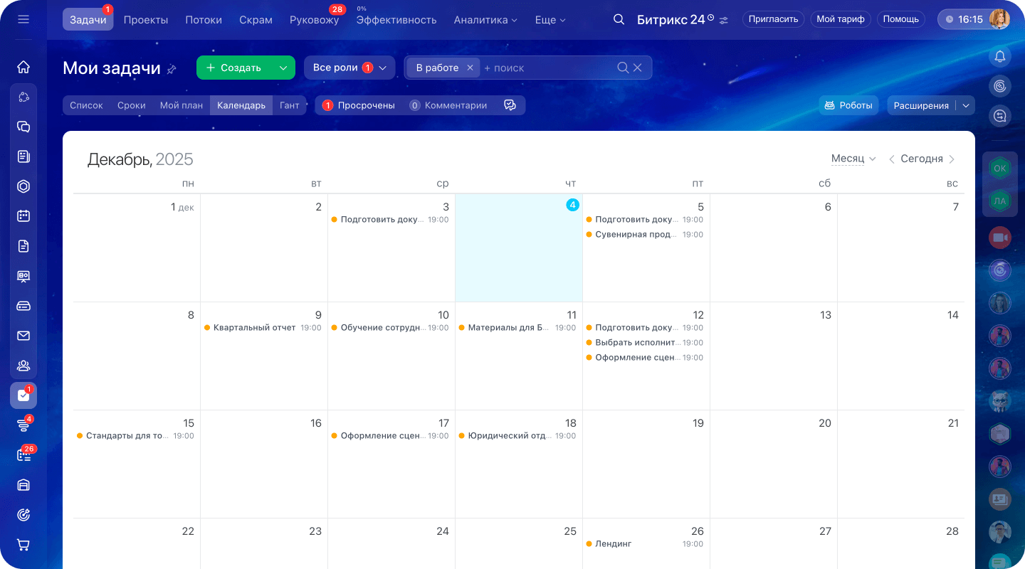 Календарь помогает планировать загруженность и следить за дедлайнами.