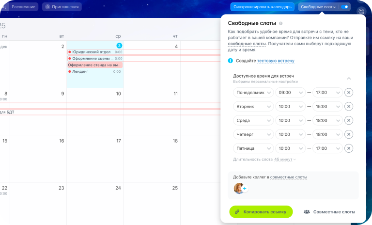 Да. Достаточно отправить ссылку — получатели увидят свободные слоты и смогут выбрать удобное время для встречи, не видя других данных вашего календаря.