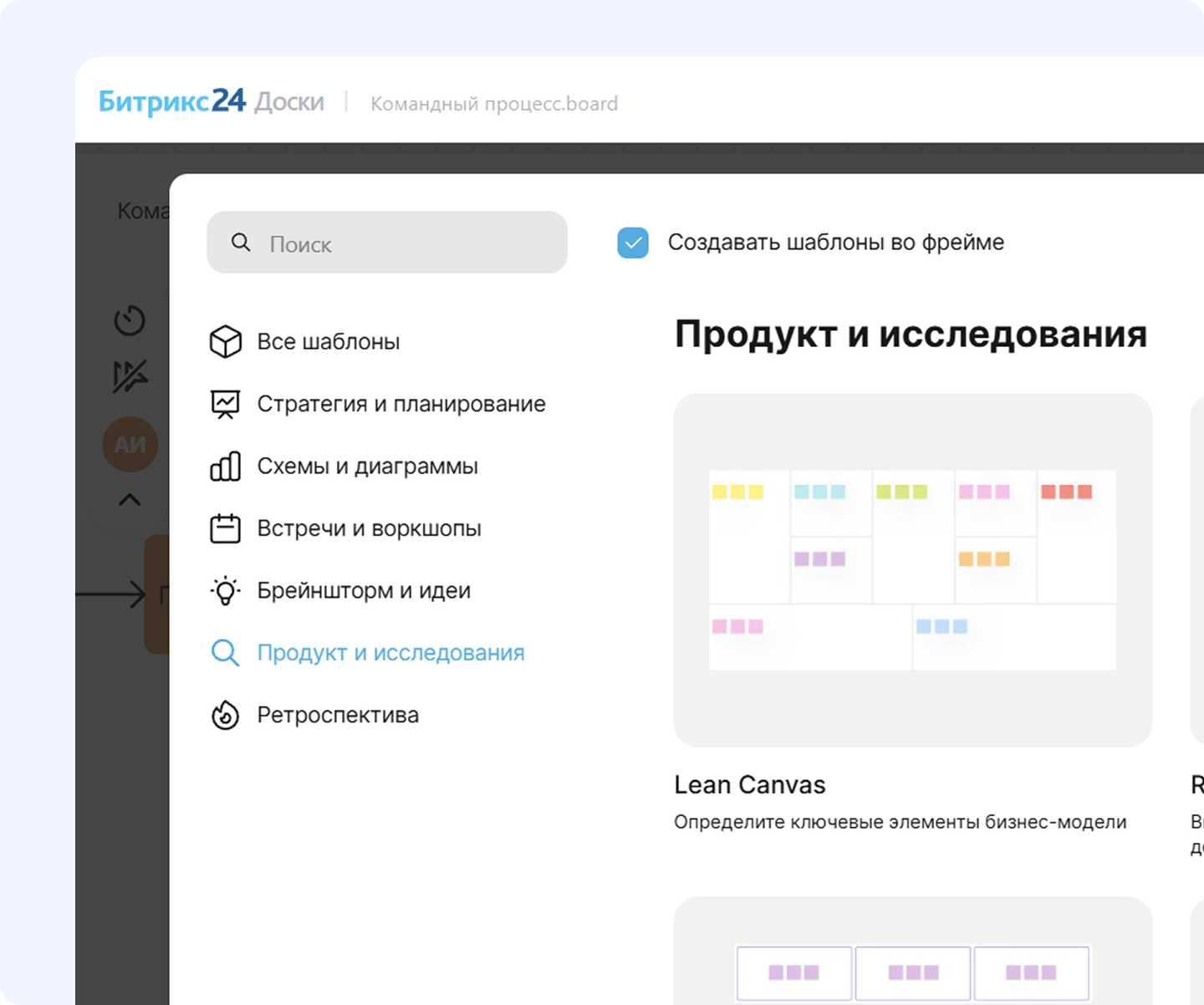 В Битрикс24 Доски есть 20+ шаблонов: SWOT, Стратегический радар, Стратегический план, Календарь 24/25, Roadmap, OKR, Канбан, Mind map, Исикава, Блок схема, Заметки о встрече, 5 почему, Небольшая таблица, Персоны, JTBD, Blueprint, Lean Canvas, Ретро, Профиль команды, Таблица, Почему и как, За и Против.