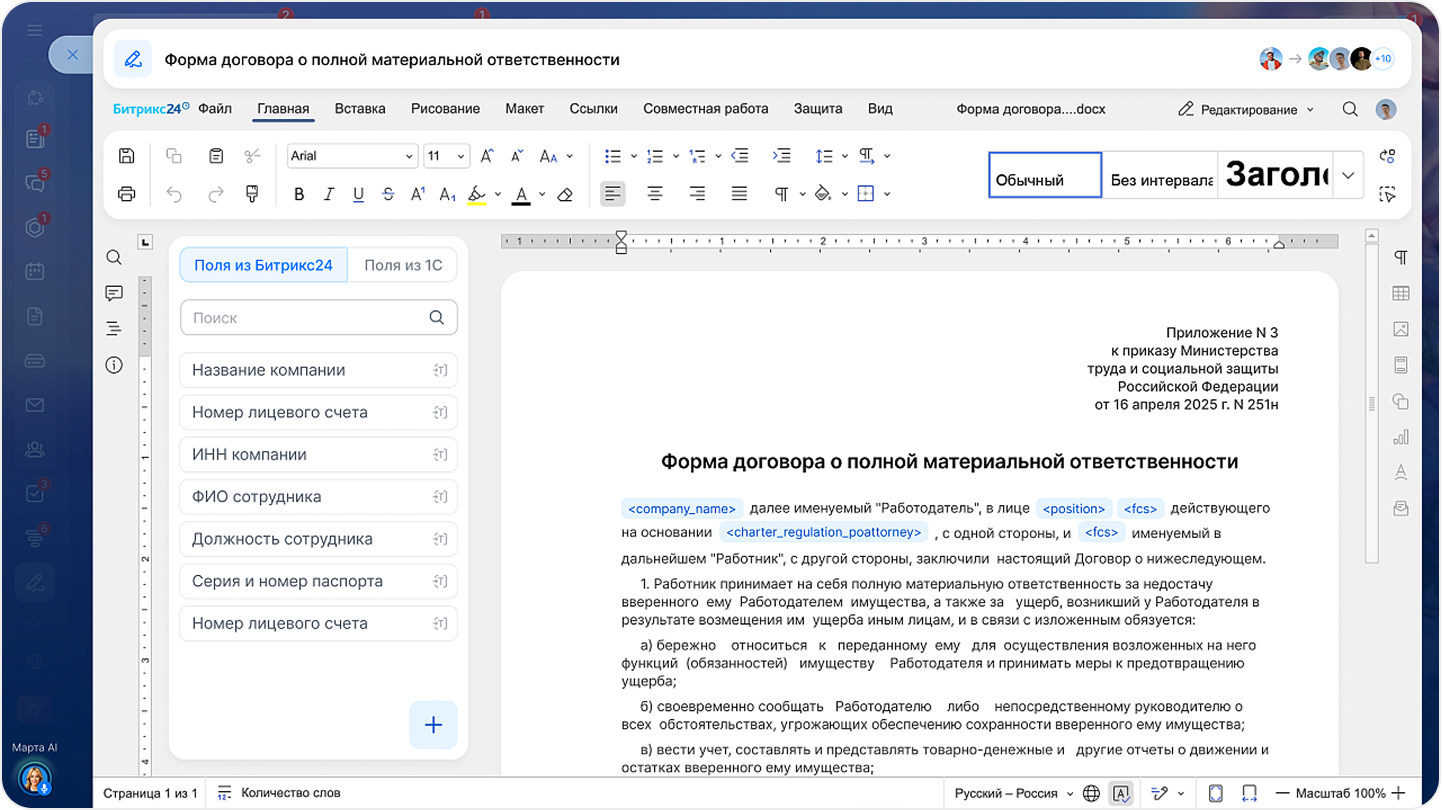 - Автозаполнение по макросам: загружайте документы с предустановленными кодами, данные подставляются автоматически