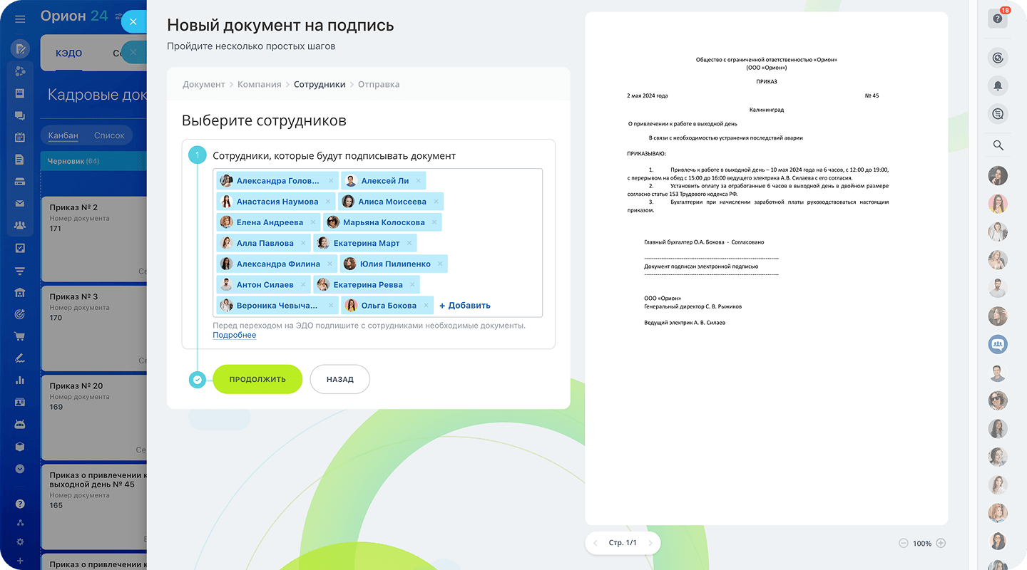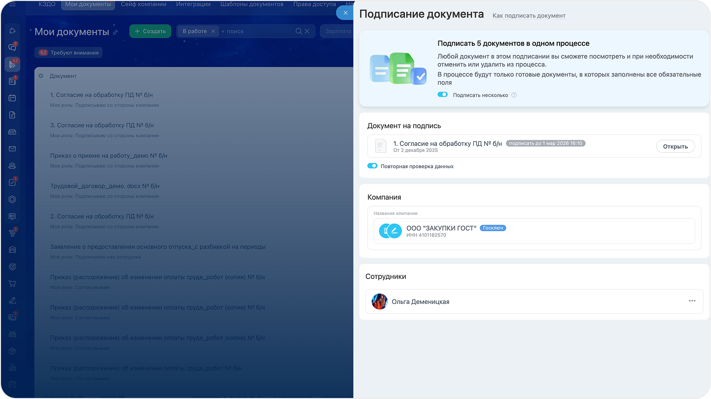 Групповое подписание автоматизирует рутину и заменяет повторяющиеся действия одним кликом. Быстро при 10, 100 и 1000 сотрудников.
