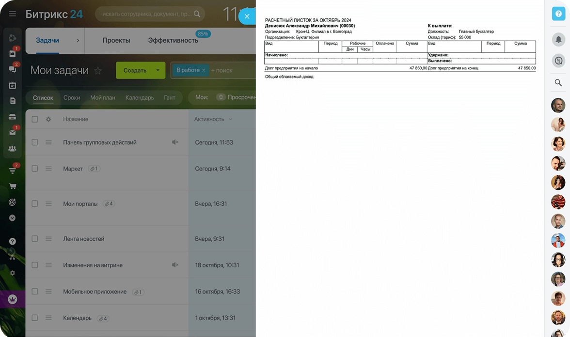 - Сотрудники отслеживают расчетные листки и остатки отпуска в Битрикс24, не заходя в 1С