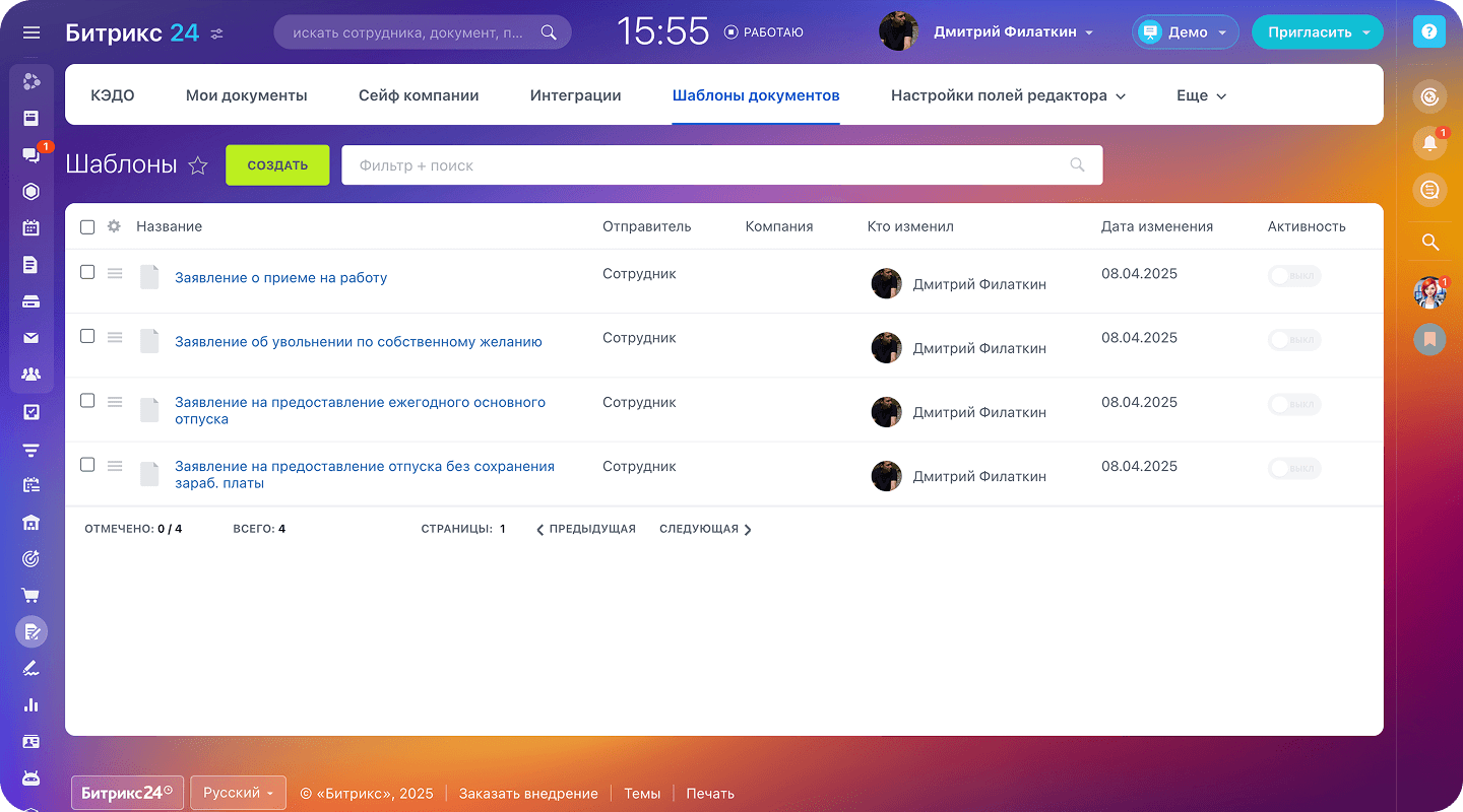 Битрикс24 КЭДО создан для неподготовленных пользователей. Интерфейс интуитивно понятен: сотрудники подписывают документы в несколько кликов – со смартфона или компьютера. Кадровые специалисты работают с шаблонами и канбан-доской, а уведомления приходят прямо в чаты. Даже без обучения сотрудники быстро осваивают систему благодаря логичной структуре и подсказкам — сложных настроек или технических навыков не требуется.