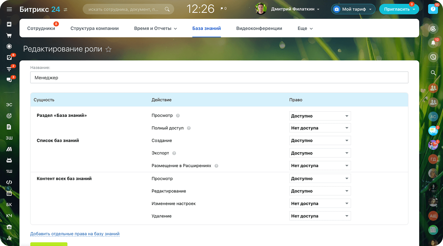 Вы сами решаете, какую информацию могут видеть и редактировать сотрудники. Настроить права доступа можно ко всем базам знаний сразу или к каждой конкретной базе.
