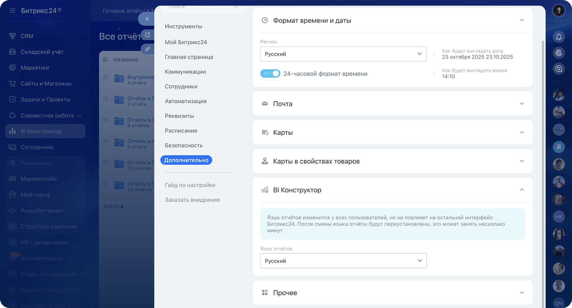 BI конструктор встроен прямо в Битрикс24 — не нужны дополнительные сервисы вроде PowerBI. Это экономит бюджет (нет отдельных лицензий) и время (данные из CRM, маркетинга и других модулей доступны сразу). Все отчёты и дашборды работают в едином интерфейсе с гибкими настройками доступа.