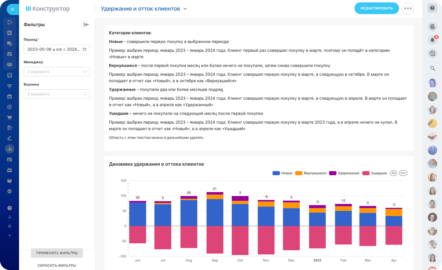 Анализируйте ключевые показатели со встроенными отчётами: ABC-анализ, аналитика сделок, звонков, бизнес-процессов, удержание клиентов и другие. Добавляйте нужные данные в стандартные отчёты или создавайте свои.