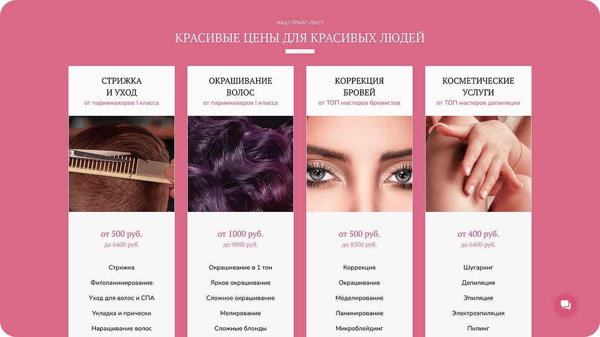 Не обязательно создавать сайт салона красоты или парикмахерской с чистого листа — воспользуйтесь готовыми тематическими шаблономи. Вся структура сайта уже продумана, а тексты, изображения, цвета и шрифты меняются в пару кликов. Вам останется только нажать кнопку и опубликовать сайт. Всё просто!
