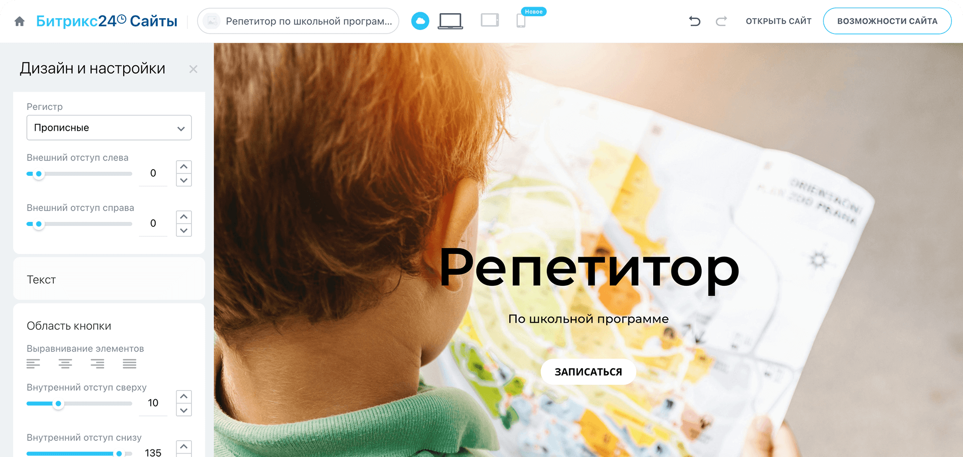 Сайт репетитора, созданный в конструкторе Битрикс24, технически оптимизирован: он адаптирован под все устройства, имеет быстрый отклик и корректную структуру. Вы сможете самостоятельно настроить мета-теги, карту сайта и файл robots.txt — всё это доступно прямо в редакторе.