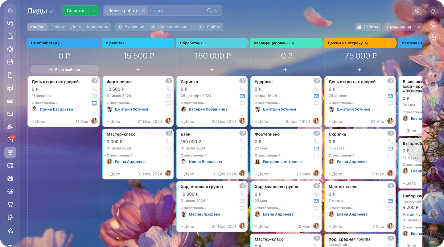 Настройте воронки продаж в Битрикс24 CRM, отслеживйте статусы учеников и управляйте информацией о клиентах.