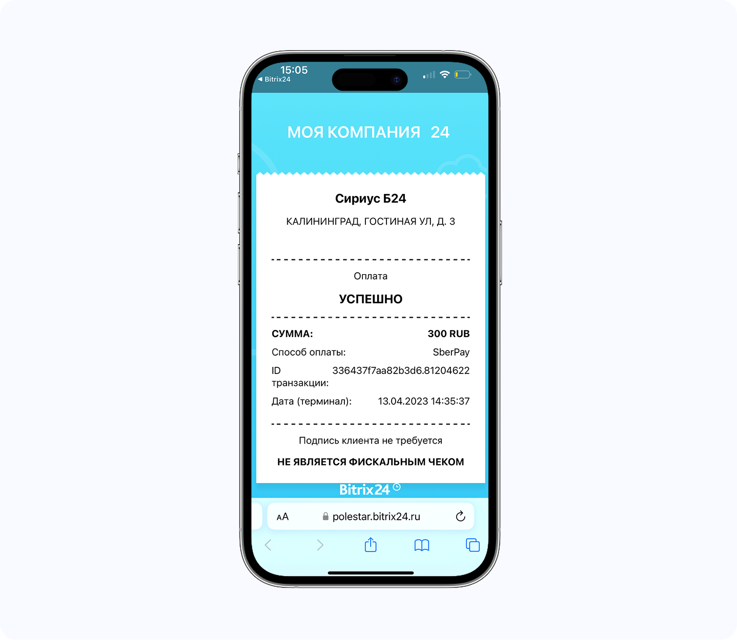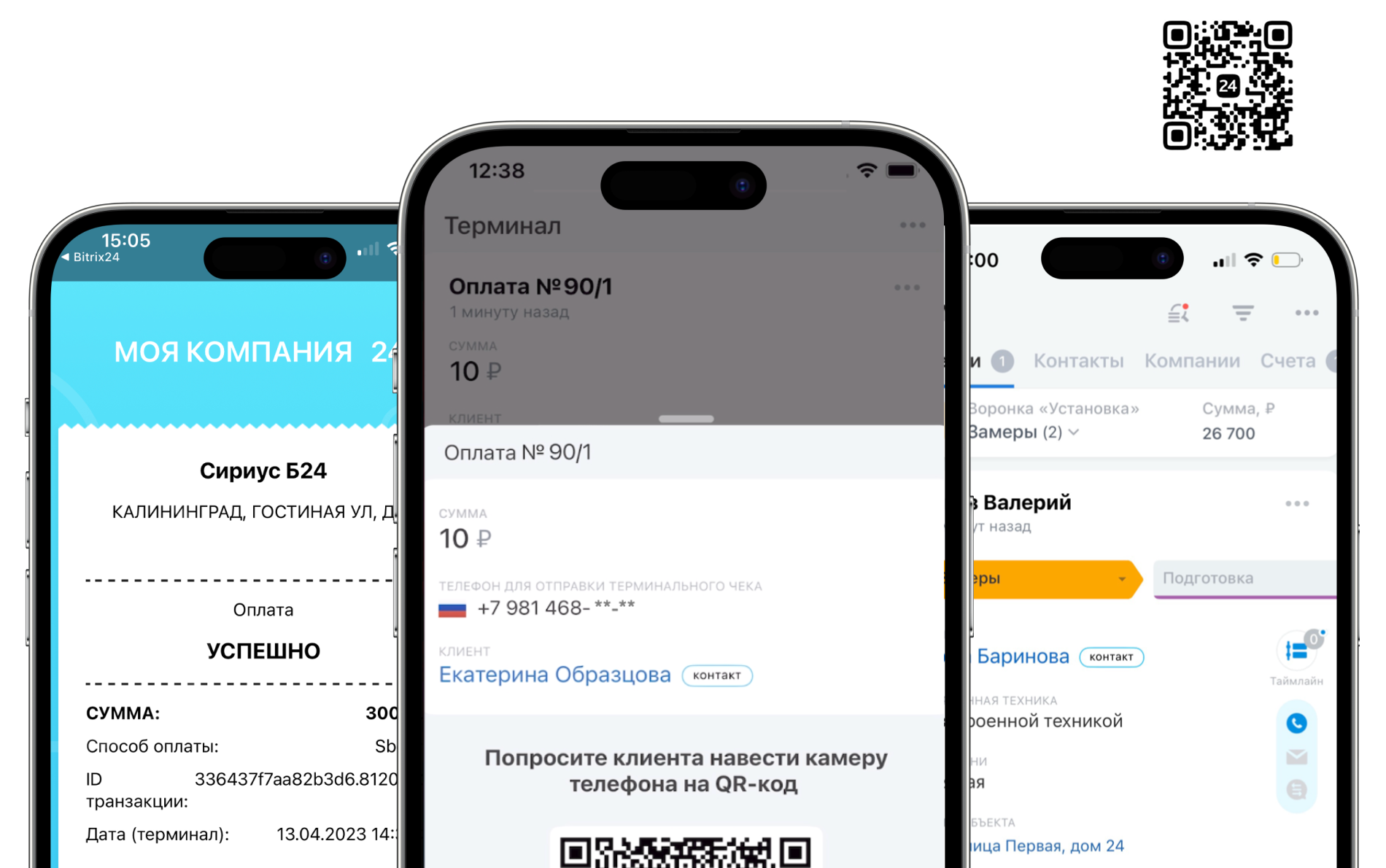 В мобильном приложении Битрикс24 есть отдельный раздел «Терминал». Курьеры и продавцы на точках могут использовать только Терминал, без доступа к CRM.