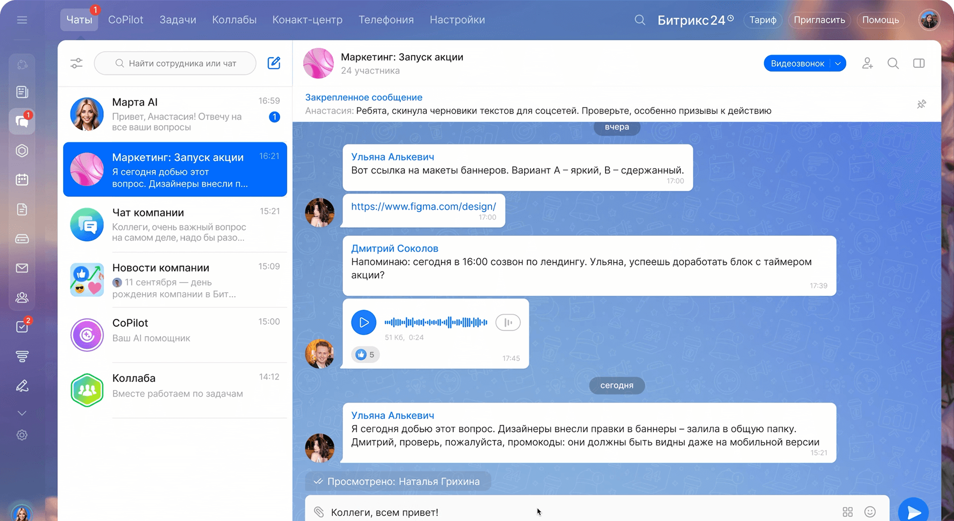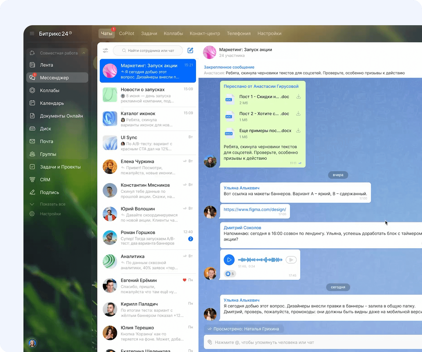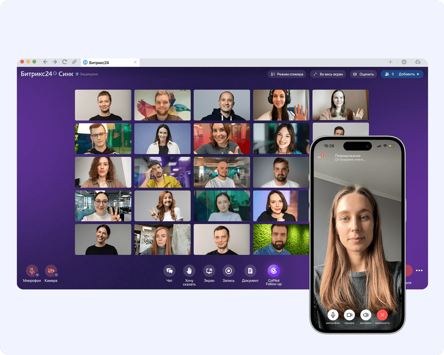 Вы можете управлять задачами и проектами, работать с CRM, планировать встречи, участвовать в чатах и звонках, просматривать уведомления и работать с файлами.