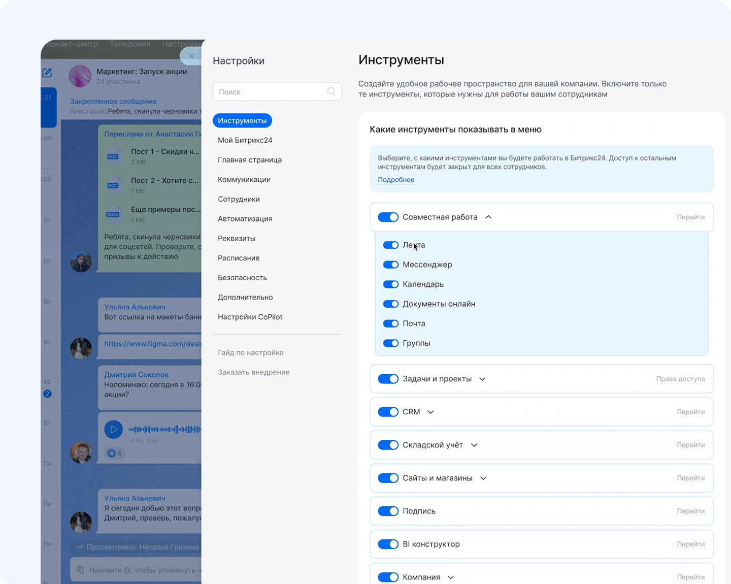 Выбирайте нужные инструменты для работы и добавляйте их в левое меню. Сделайте главный инструмент стартовой точкой для работы. Настраивайте уведомления, фон приложения, автоматизируйте рутинные задачи и работайте так, как вам привычно и удобно.