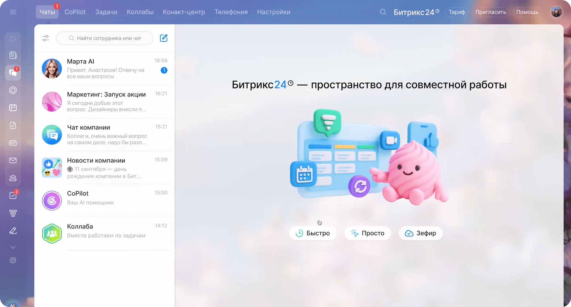 Все необходимые инструменты для общения внутри компании в одном приложении.
