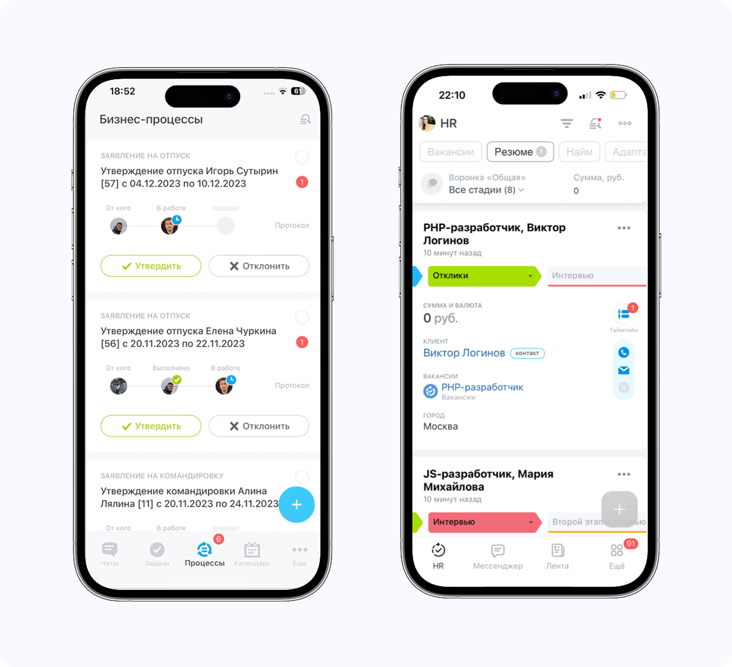 Да, вы можете полностью управлять клиентской базой, создавать и вести сделки, просматривать карточки клиентов и работать с задачами CRM прямо в мобильной версии.