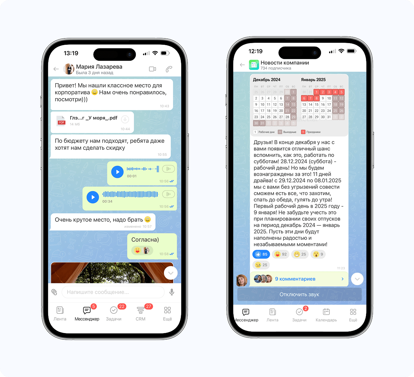 Да, вы можете совершать и принимать звонки, включая SIP-телефонию и звонки из CRM. Также доступны видеозвонки и конференции внутри команды.
