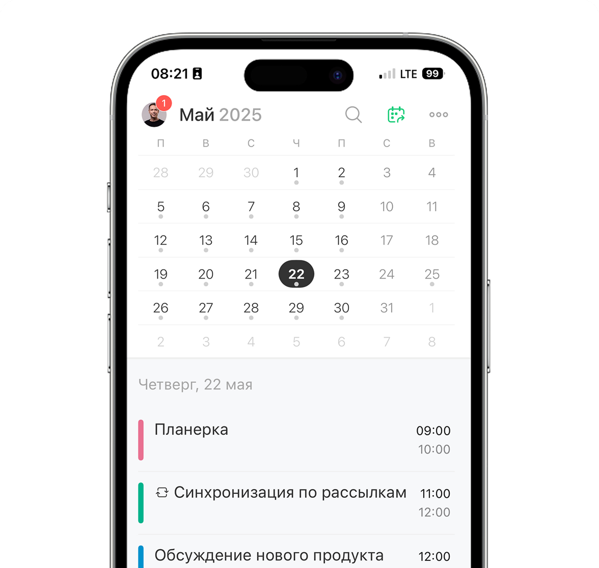 Обсуждайте рабочие вопросы, обменивайтесь файлами и документами в персональных и групповых чатах. Прямо из переписки ставьте задачи и создавайте встречи в календаре.