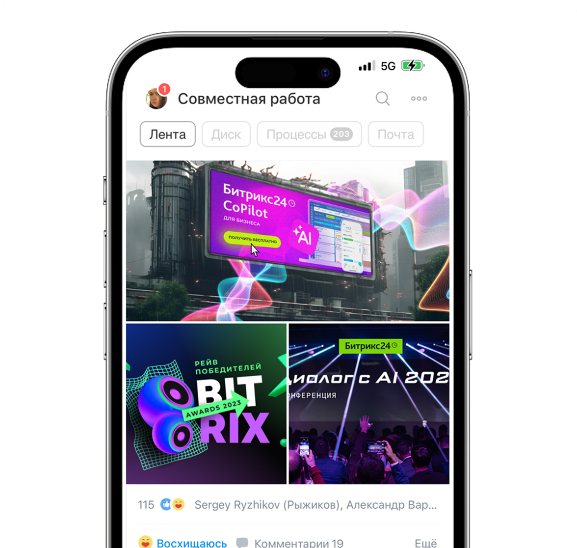 Работать в Битрикс24 так же просто и удобно, как в привычном мессенджере. Он объединяет всех сотрудников, ускоряет коммуникацию и повышает производительность команд.