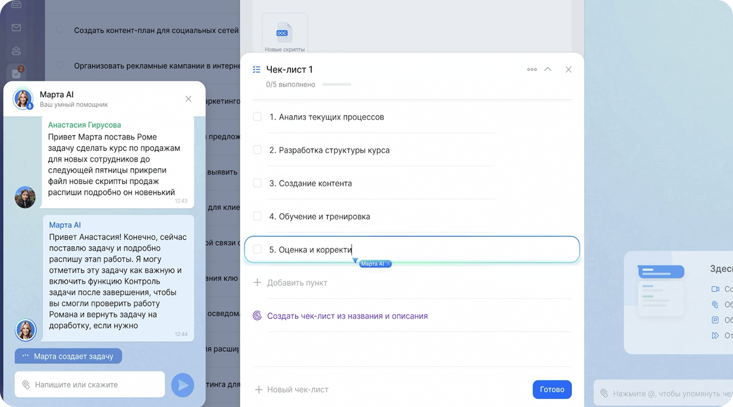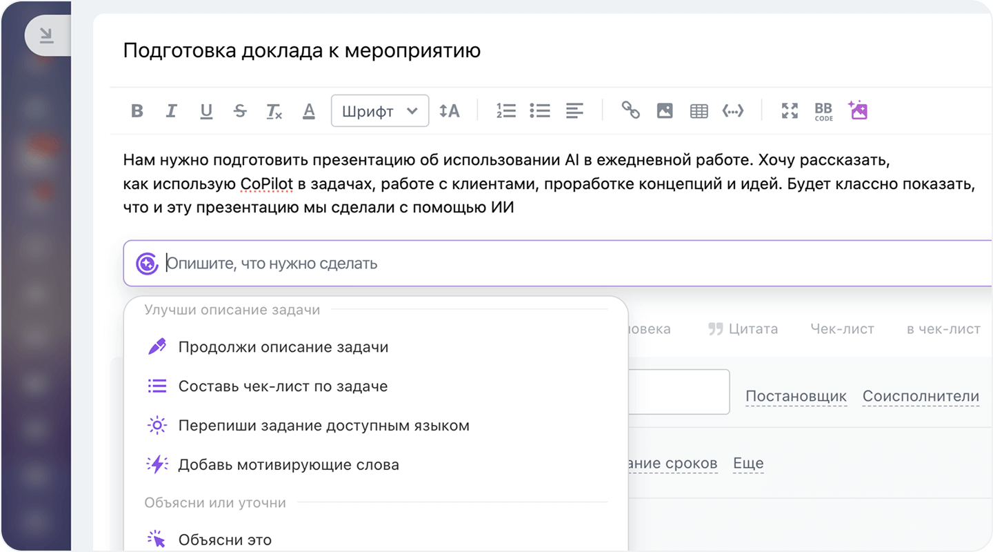 Не тратьте время на проработку и формулирование ТЗ задачи. AI берёт это на себя: просто напишите или проговорите своими словами, что нужно сделать — он превратит это в чёткий, понятный текст и составит пошаговый чек-лист.