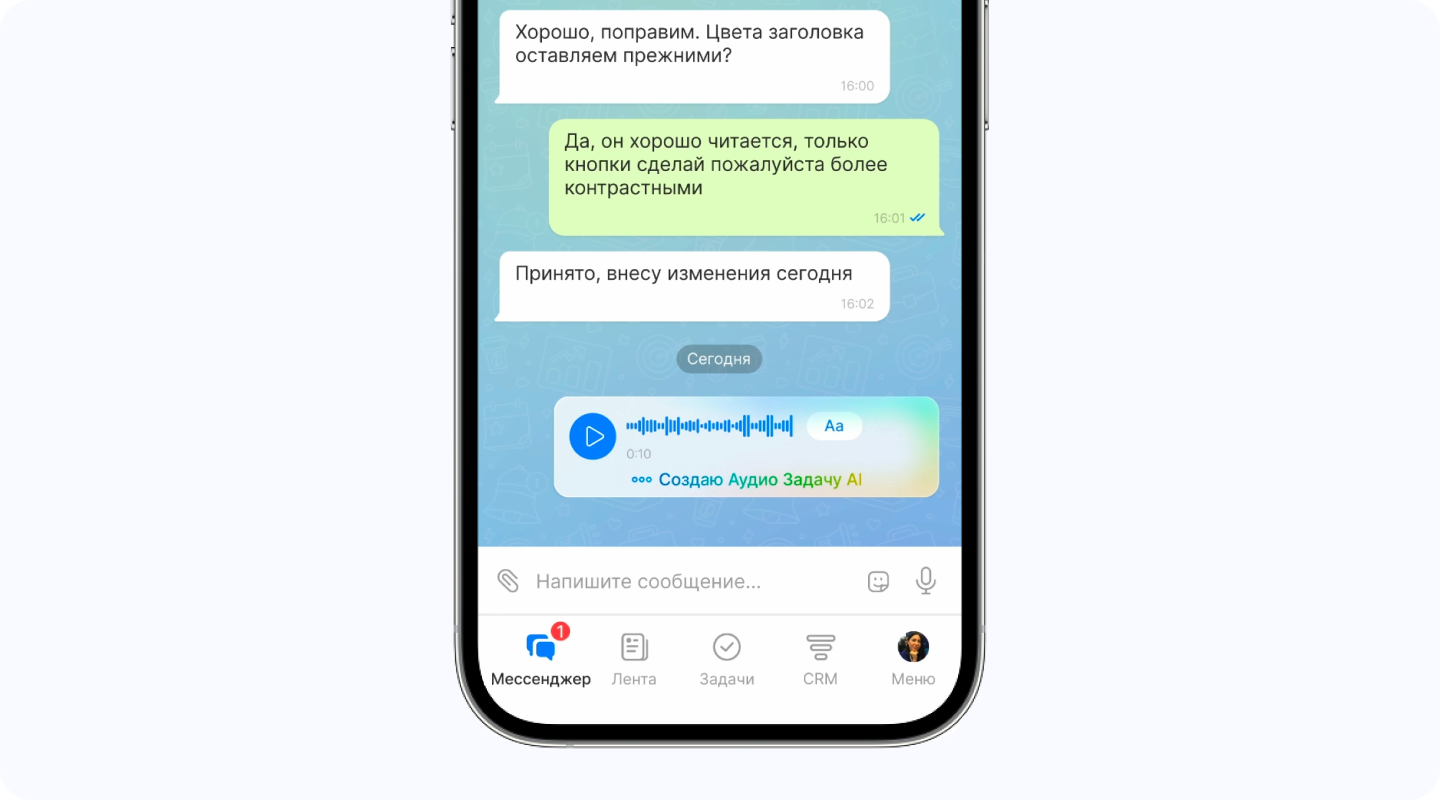 - AI автоматически распознает задачи в голосовых сообщениях, заполняет нужные поля и ставит ответственных