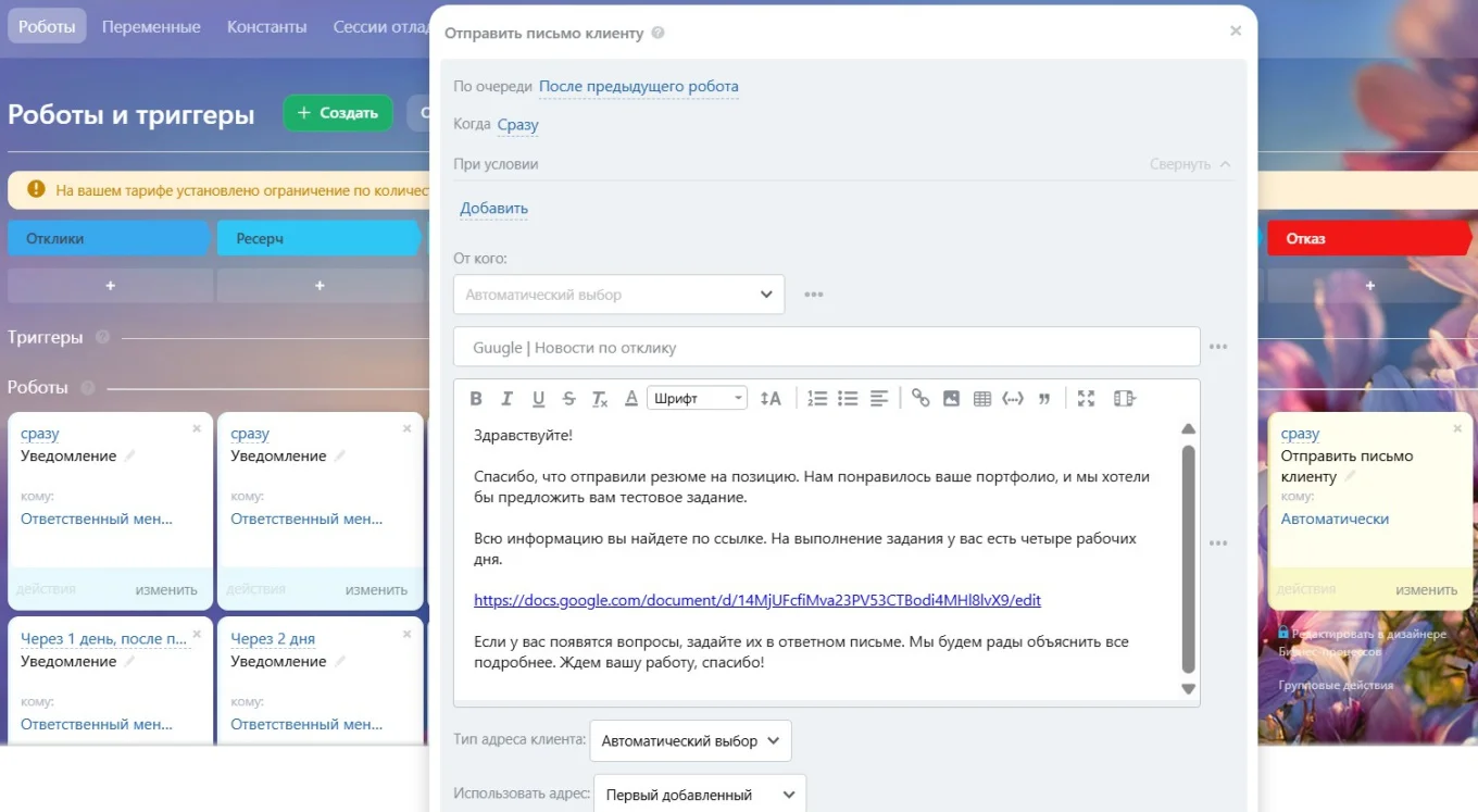 Общаться с кандидатами. Роботы Битрикс24 могут автоматически отправлять кандидатам сообщения и письма — достаточно задать шаблон и настроить условия, когда система должна это делать. Например, как только рекрутер передвинет карточку соискателя на этап «Тестовое задание».