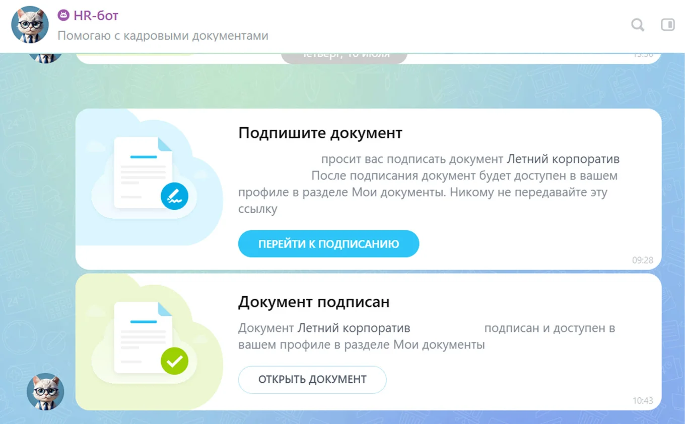 Подписывать некоторые кадровые документы. HR-бот напоминает сотрудникам о документах, которые нужно подписать, — приказы о корпоративах, согласия на обработку персональных данных, новые положения компании. Сотрудник получает уведомление с кнопкой «Перейти к подписанию», ставит электронную подпись за пару кликов, и документ автоматически попадает в его личное дело. HR-менеджеру не нужно обзванивать всех и собирать подписи вручную — система показывает, кто уже подписал, а кому нужно отправить напоминание.