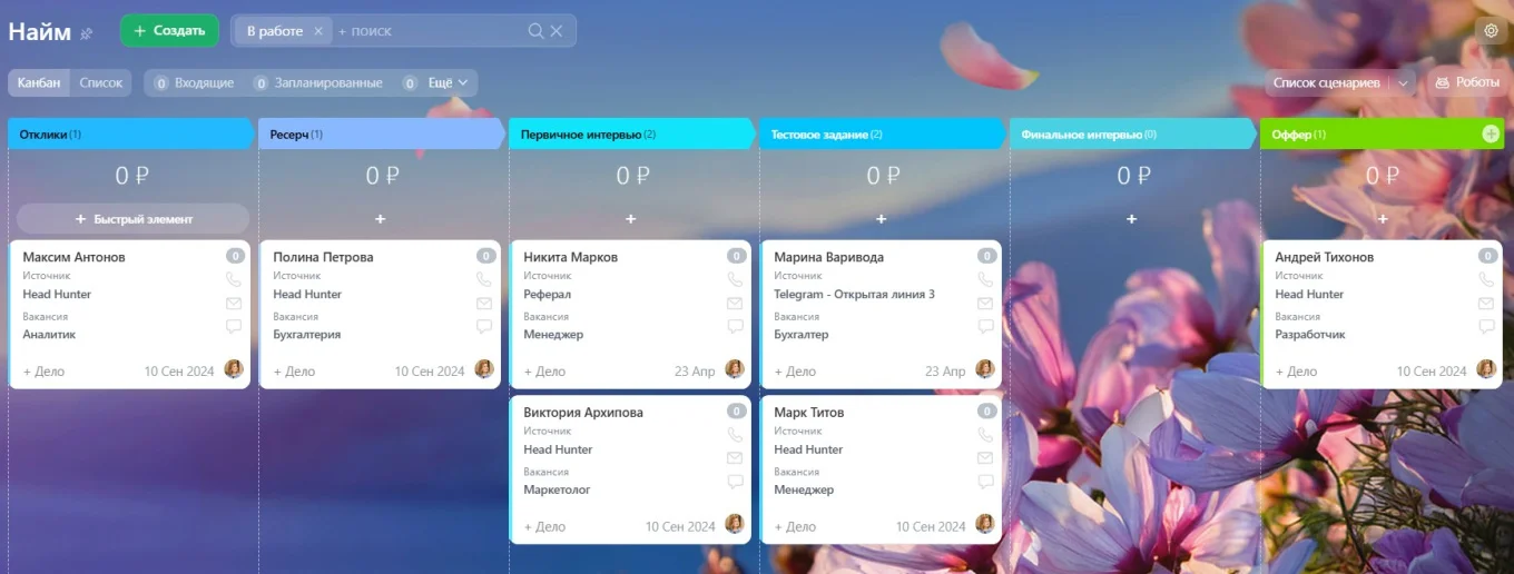 Упорядочивать наем. Система помогает собирать всех кандидатов на одной канбан-доске и располагать соискателей по этапам: от отклика до финального собеседования. Так рекрутерам не нужно держать всю информацию в голове или искать резюме в разных папках — Битрикс24 показывает, на какой стадии находится каждый претендент.