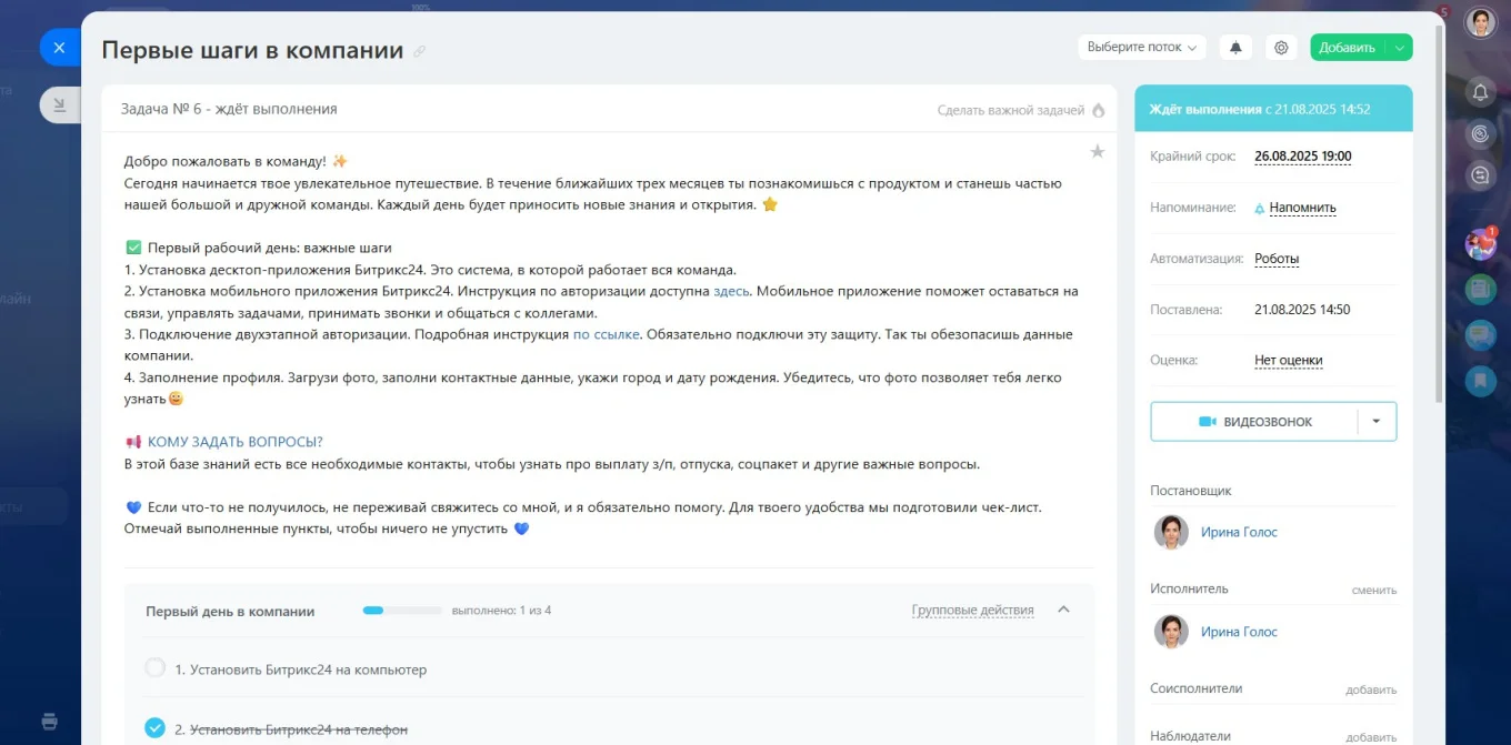 Адаптировать новичков. HR People Partner может создать шаблон первой задачи для новичка: пройти инструктаж, изучить положения компании, получить доступы ко всем сервисам. Сотрудник получит четкий план на первые дни и недели работы, а HR-менеджер сможет проверить, что выполнено, и при необходимости скорректировать план.