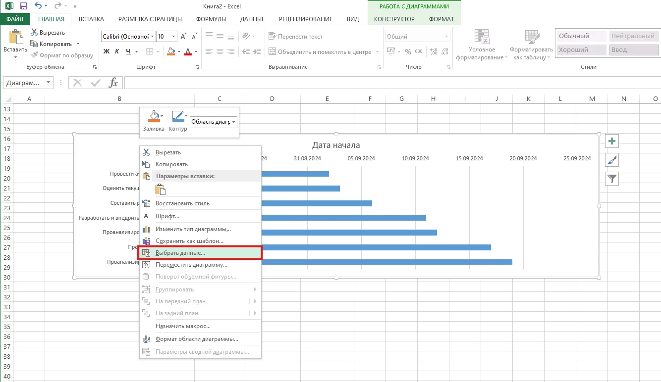 Сейчас на диаграмме вместо названий задач — цифры. Чтобы поменять это, кликните на область диаграммы правой кнопкой мыши → «Выбрать данные».