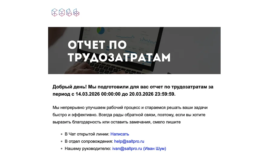 Еженедельный отчет. Каждый понедельник клиент автоматически получает на почту отчет о работе за прошедшую неделю. Если работ не было — система сообщает об этом и напоминает, что можно поставить задачу. Ни один сотрудник в этом процессе не участвует.